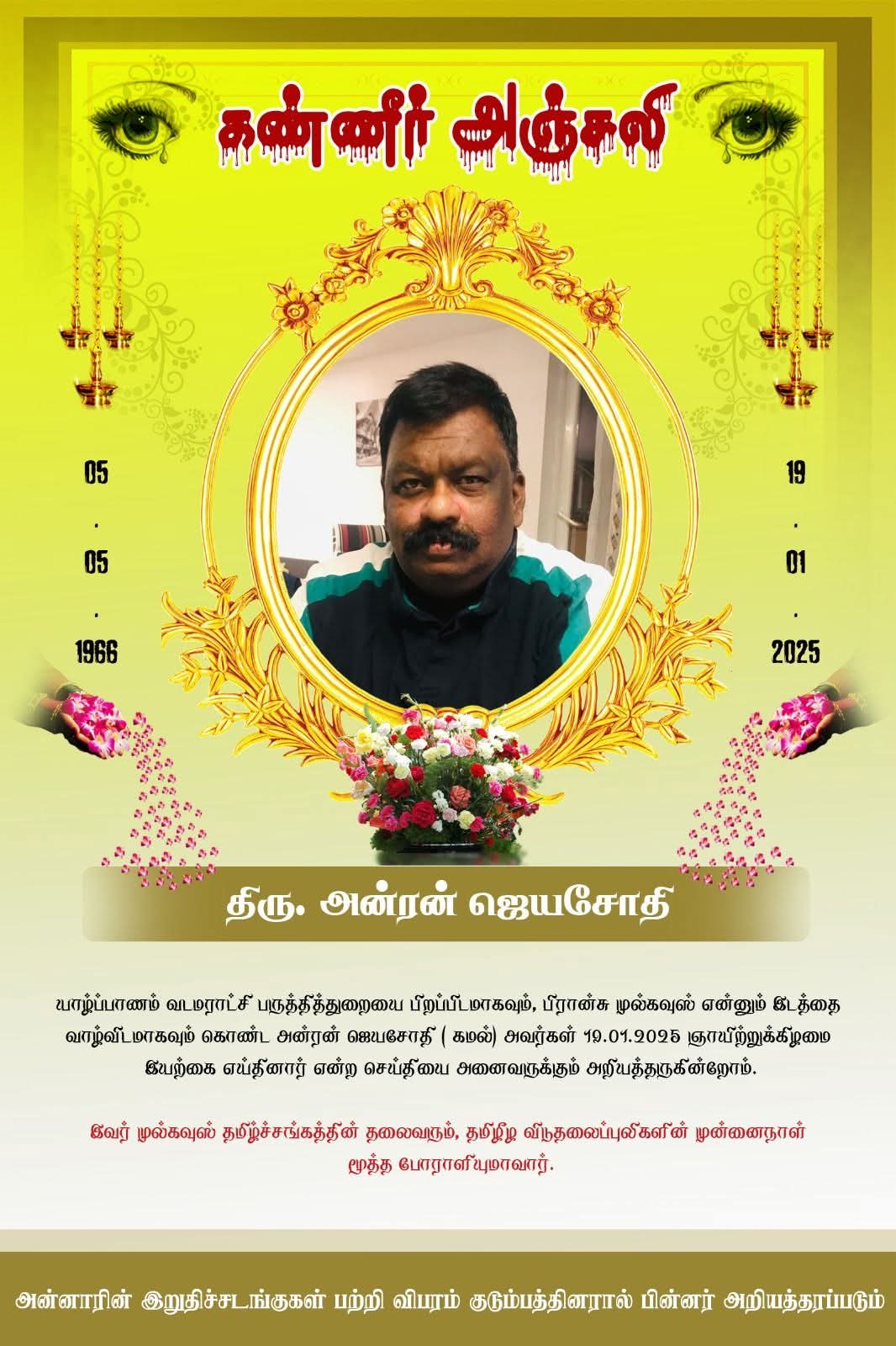 பிரான்சின் முல்கவுஸ் தமிழ்ச்சங்கத்தின் தலைவரும், தமிழீழ விடுதலைப்புலிகளின் முன்னைநாள் மூத்த போராளியுமான அன்ரன் ஜெயசோதி ( கமல்) (வயது 59) அவர்கள் நேற்று (19.01.2025) ஞாயிற்றுக்கிழமை திடீர் உடல்நலக்குறைவால் சாவடைந்துள்ளார்.