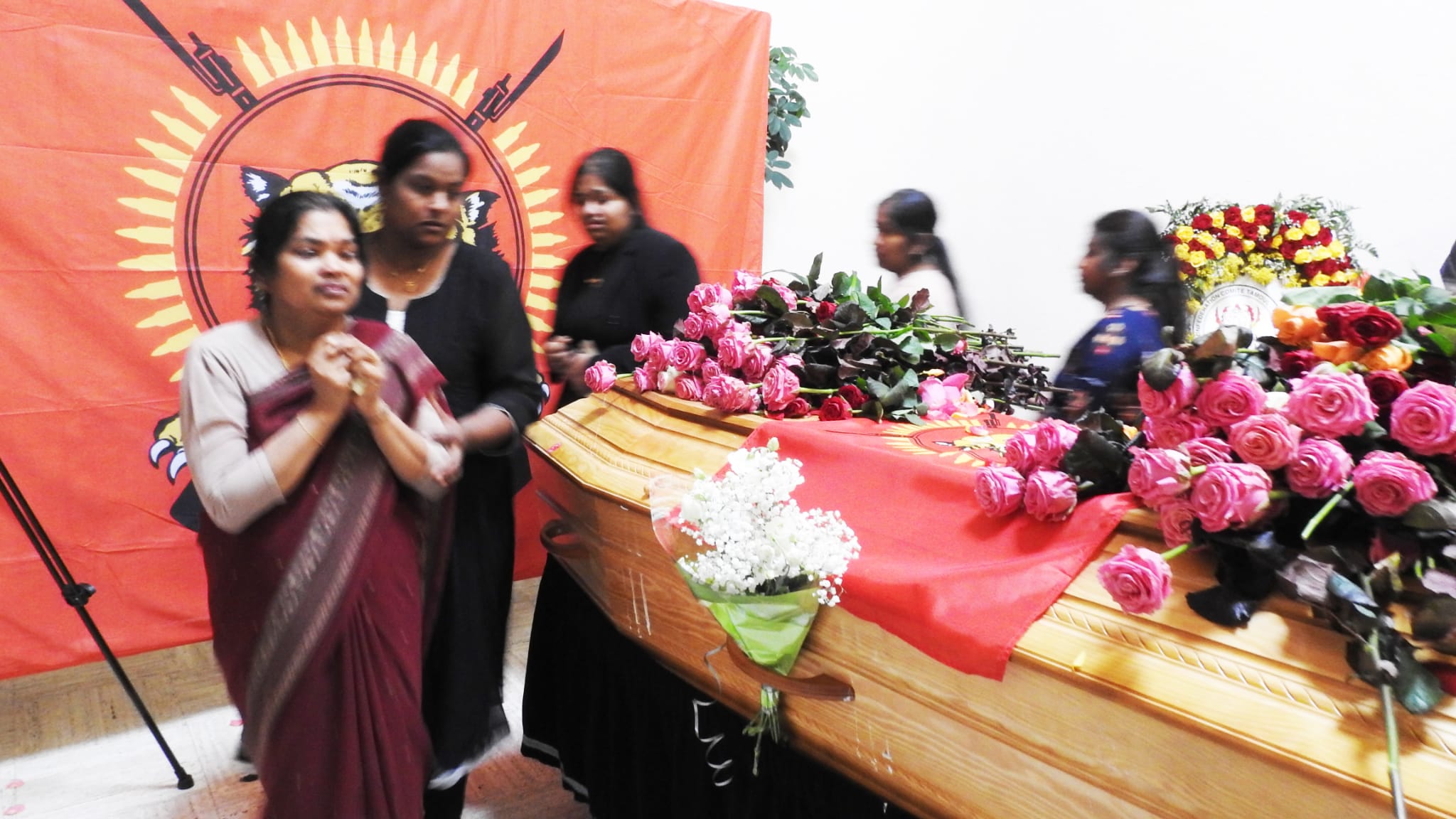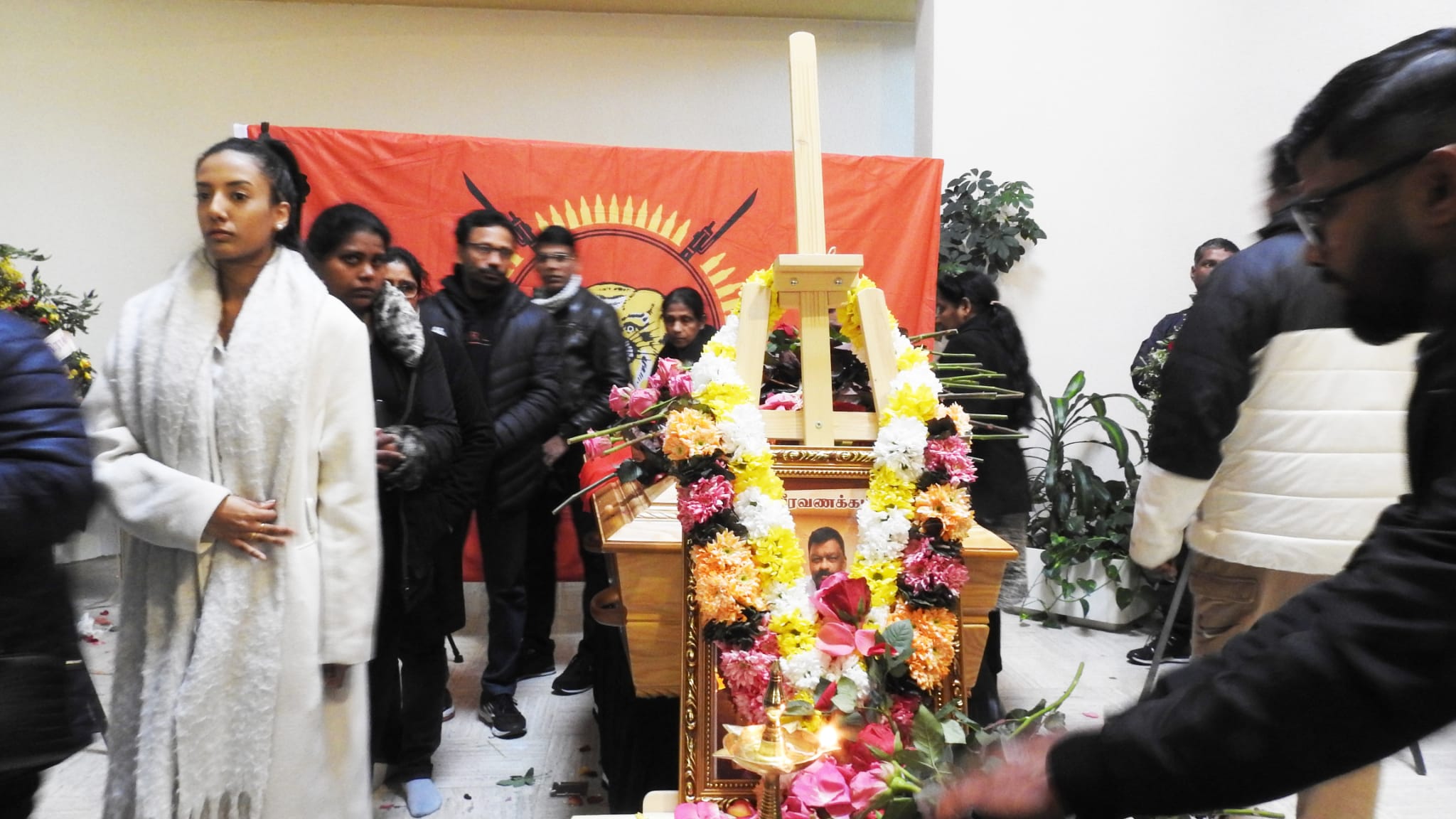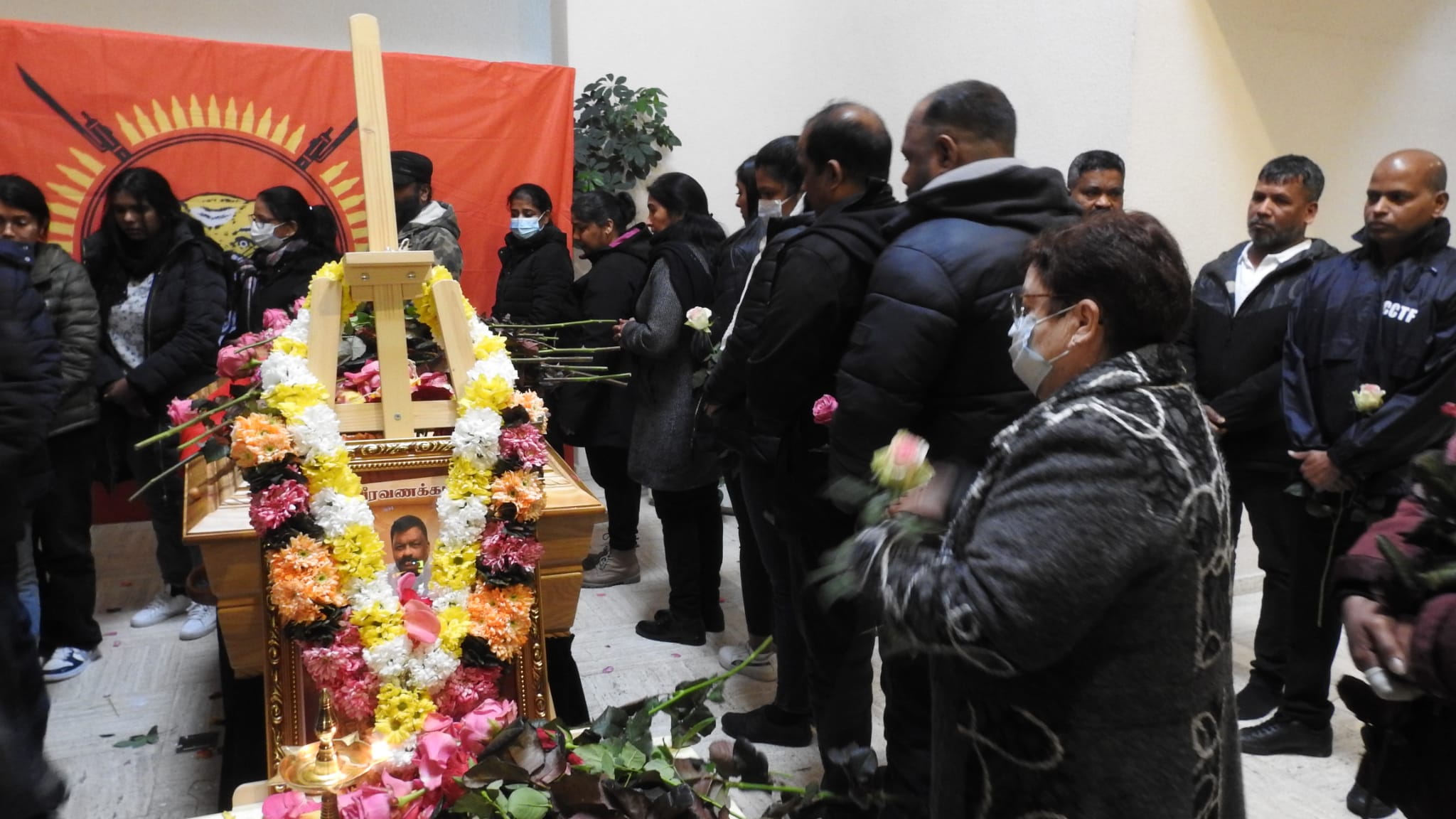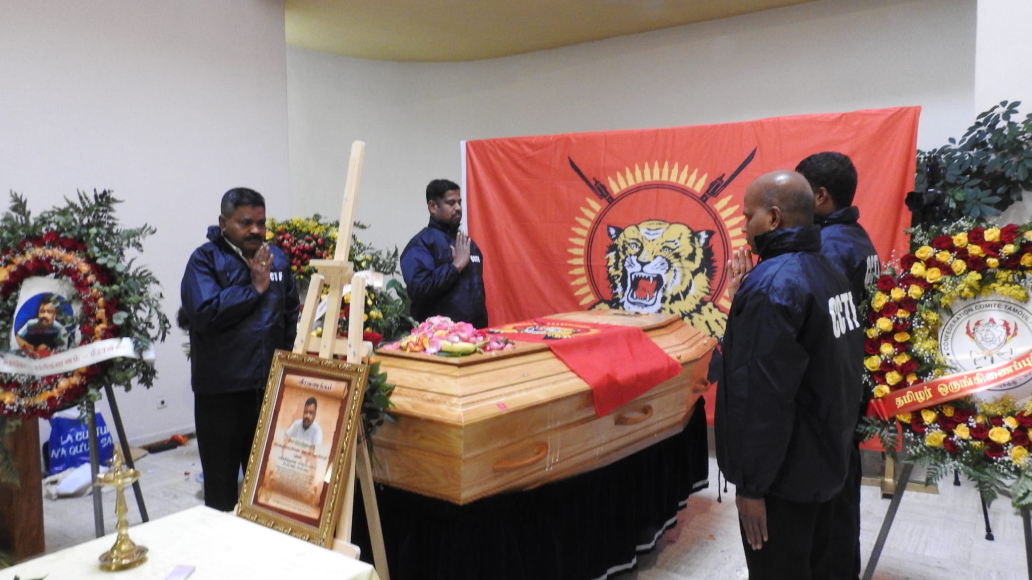 காலை அவரின் சமயரீதியான சடங்குகள் நடைபெற்று முடிந்த பின்னர் 10.00 மணியளவில் அவரின் திருவுருவப்படம் தமிழீழ தேசிக்கொடியை தமிழர் ஒருங்கிணைப்புக்குழு உறுப்பினர்கள், மாவீரர் பணிமனை செயற்பாட்டாளர்கள், பிராங்கோ தமிழ்ச்சங்கத்தைச் சார்ந்தவர்கள் தாங்கி வர அவர்குறித்து தமிழீழ விடுதலைப் புலிகளின் அனைத்துலகத் தொடர்பகத்தால் வெளியிடப்பட்ட அறிக்கை வாசிக்கப்பட்டு அவரின் புகழ் உடலின் மீது தமிழீழத்தேசியக்கொடி போர்த்து மரியாதை செய்யப்பட்டது.