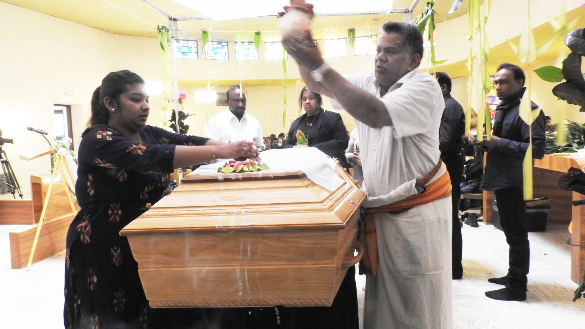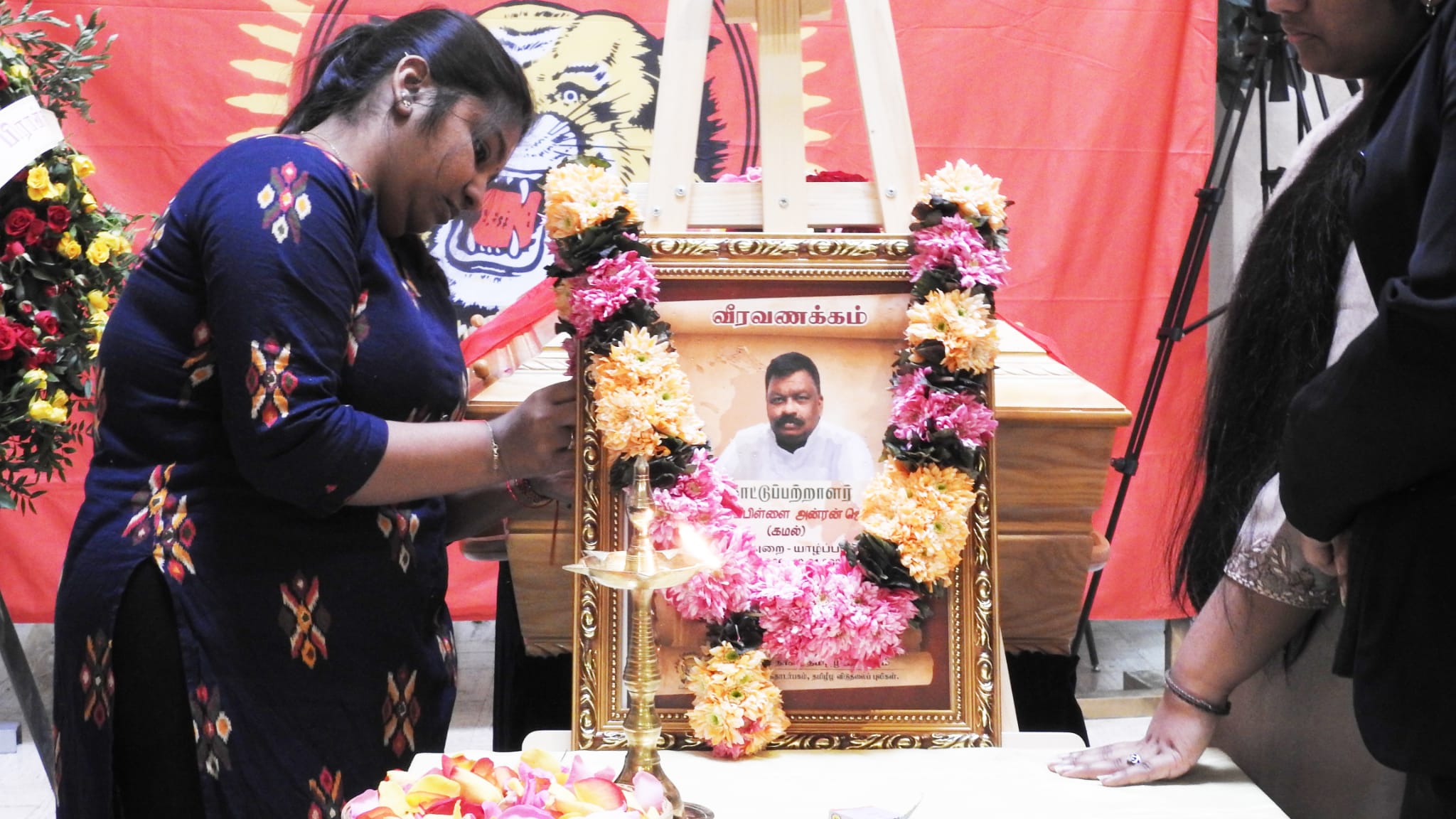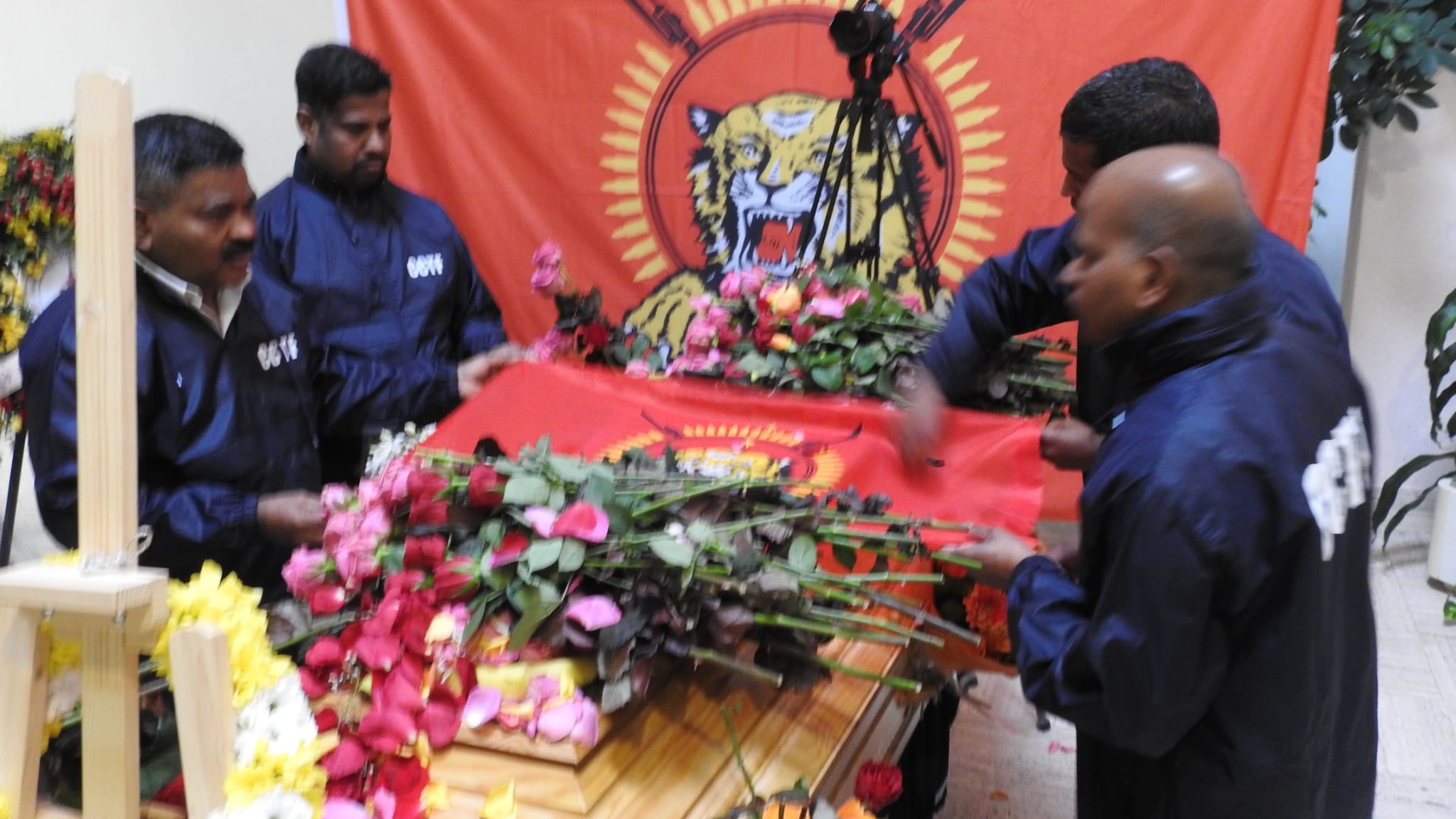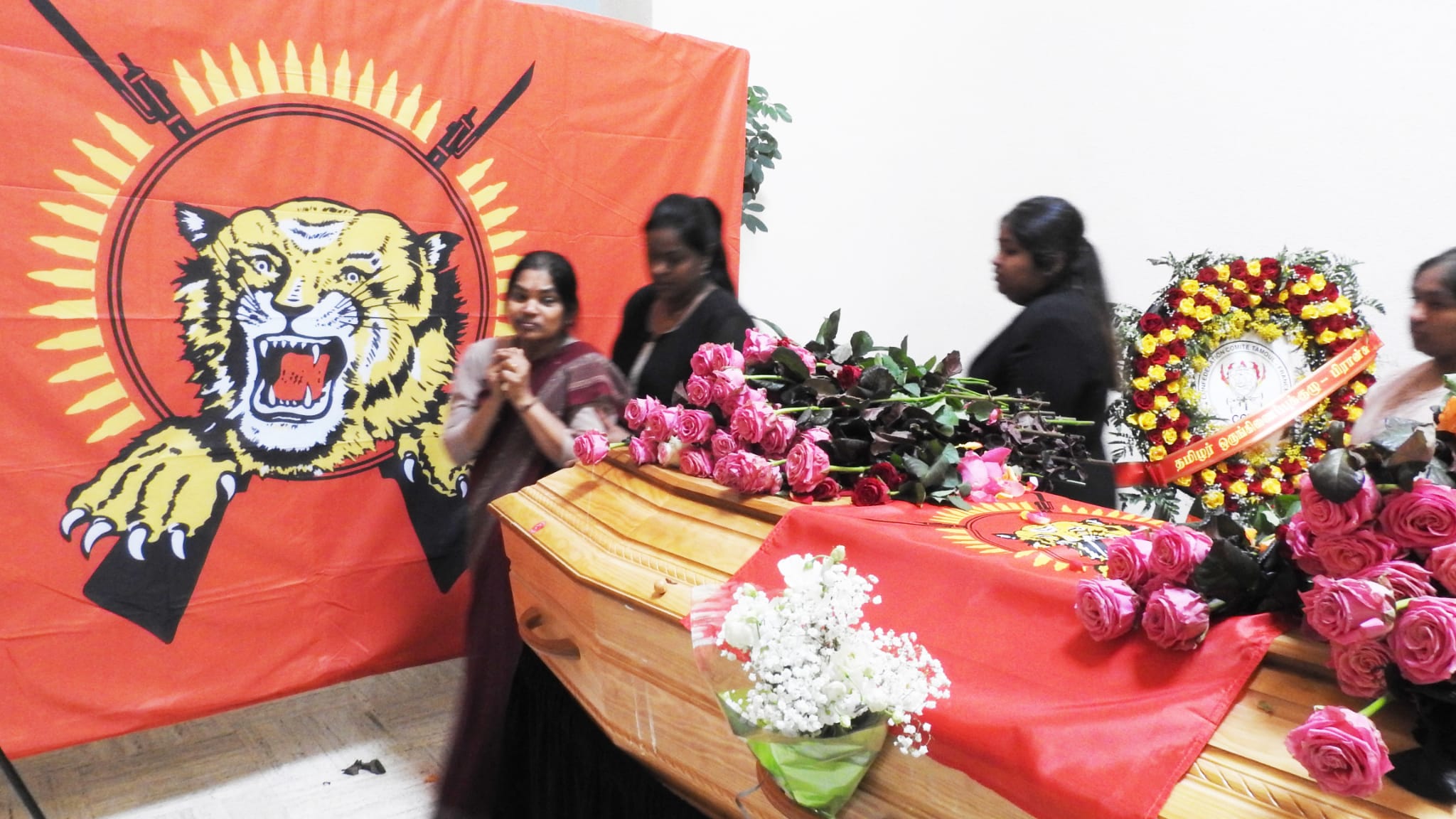 காலை அவரின் சமயரீதியான சடங்குகள் நடைபெற்று முடிந்த பின்னர் 10.00 மணியளவில் அவரின் திருவுருவப்படம் தமிழீழ தேசிக்கொடியை தமிழர் ஒருங்கிணைப்புக்குழு உறுப்பினர்கள், மாவீரர் பணிமனை செயற்பாட்டாளர்கள், பிராங்கோ தமிழ்ச்சங்கத்தைச் சார்ந்தவர்கள் தாங்கி வர அவர்குறித்து தமிழீழ விடுதலைப் புலிகளின் அனைத்துலகத் தொடர்பகத்தால் வெளியிடப்பட்ட அறிக்கை வாசிக்கப்பட்டு அவரின் புகழ் உடலின் மீது தமிழீழத்தேசியக்கொடி போர்த்து மரியாதை செய்யப்பட்டது.