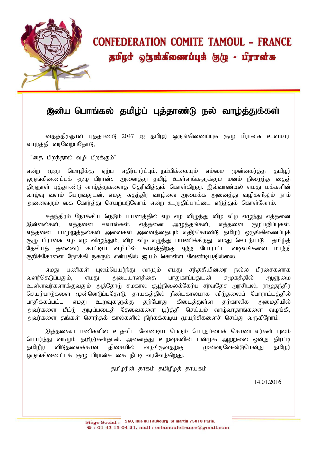 பிரான்சு தமிழர் ஒருங்கிணைப்புக்குழு விடுத்துள்ள பொங்கல் தமிழ்ப் புத்தாண்டு வாழ்த்துச் செய்தியின் முழு வடிவம் இணைக்கப்பட்டுள்ளது.