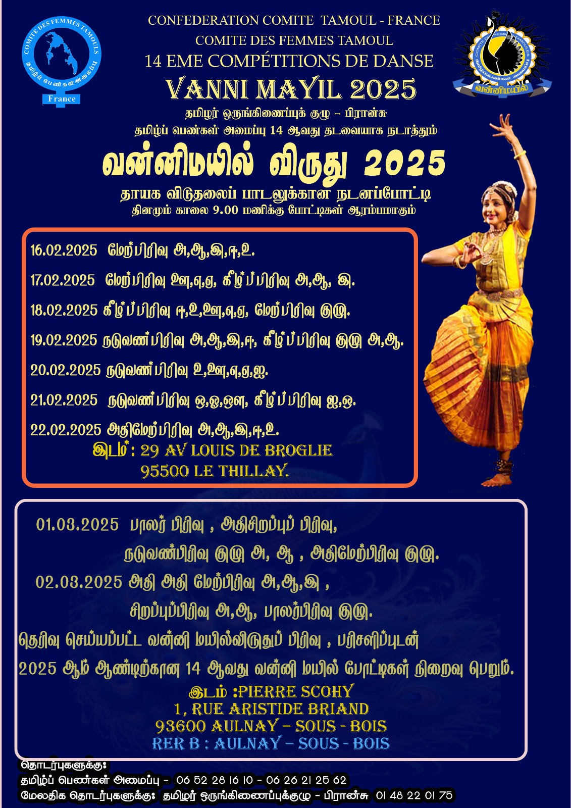 பிரான்சில் தமிழ் பெண்கள் அமைப்பு வருடாந்தம் நடாத்தும் தேசவிடுதலை பாடலுக்கான நடனப்போட்டி வன்னிமயில் 2025 – 7ஆம் நாள் போட்டிகள் இன்று சனிக்கிழமை காலை 10.00 மணிக்கு ஈகைச்சுடர் ஏற்றலுடன் ஆரம்பமாகியது.