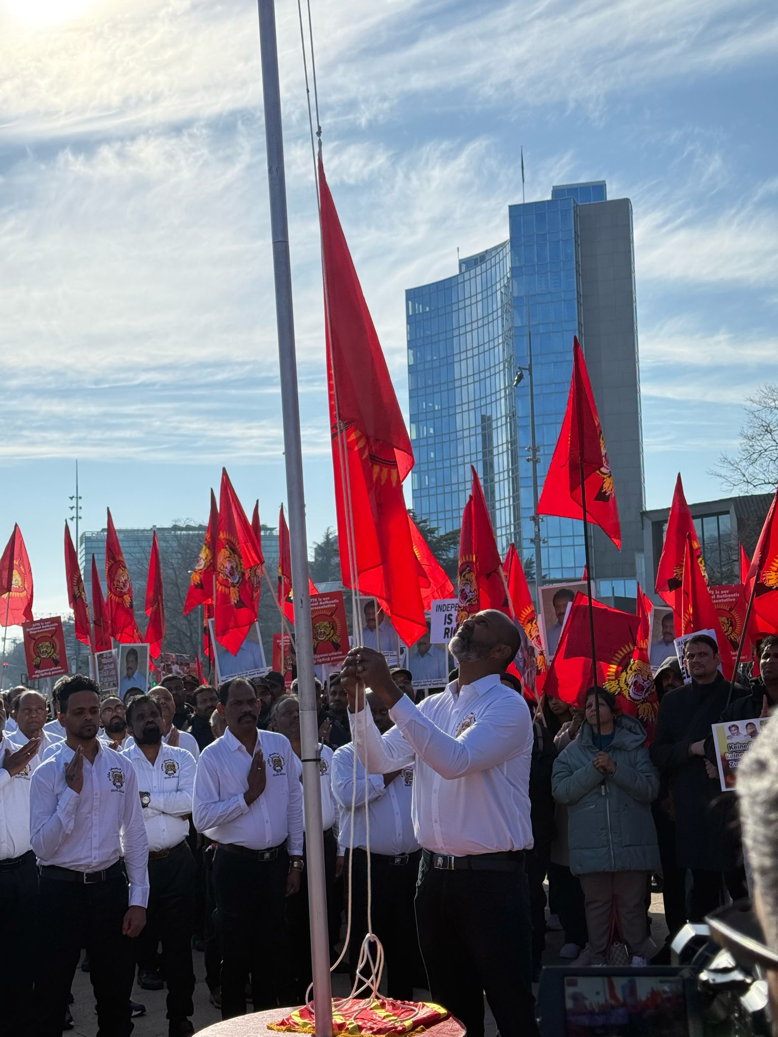 தமிழின அழிப்பிற்கு நீதி கோரி அனைத்துலக ரீதியாக நடைபெறும் மாபெரும் கவனயீர்ப்பு போராட்டம் ஐ.நா மனித உரிமைகள் பேரவையின் 58 ஆவது கூட்டத்தொடர் நடைபெற்றுவரும் நிலையில்,தமிழின அழிப்பினை மேற்கொண்ட சிங்களப் பேரினவாத அரசினை அனைத்துலக குற்றவியல் நீதிமன்றப் பொறிமுறையூடான நீதியினையும் தமிழர்களுக்கு தமிழீழமே இறுதியான தீர்வு என்பதனையும் வலியுறுத்தி 03.03.2025 இன்று பி.ப 2:00 மணியளவில் ,சுவிஸ் ஜெனிவாவில் அமைந்துள்ள ஐக்கிய நாடுகள் சபை முன்றலில் (ஈகைப்பேரொளி முருகதாசன் திடலில்) தமிழீழ தேசியகொடியேற்றப்பட்டு கவனயீர்ப்பு போராட்டம் ஆரம்பமாகி நடைபெற்று வருகின்றது.