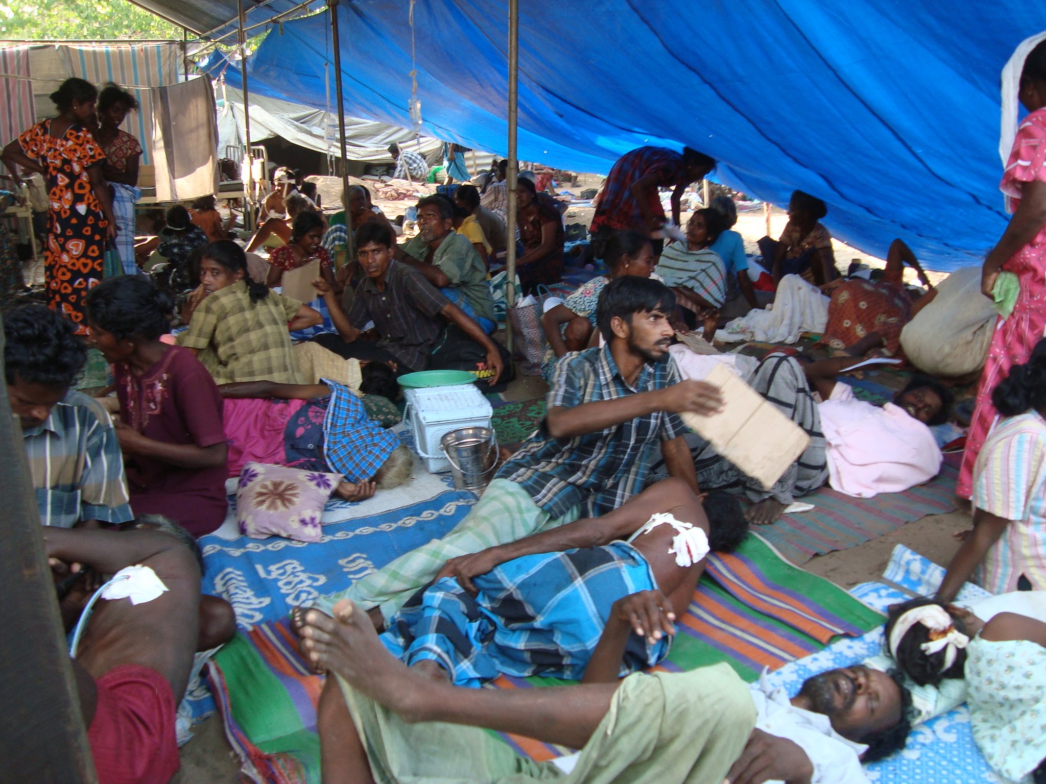 சத்திர சிகிச்சை அறைக்கு முன்னால் மாமரத்தடியில் தறப்பாளினால் (Tent) போடப்பட்டும், சன்னங்களால் சல்லடையாக்கப்பட்டுக் கிடந்த நோயாளர்களை அனுமதிக்கும் பகுதியில் கால்களை வைக்கின்றோம்; நானும் செவ்வானம் அக்காவும்..வேறு சிலரும் ..