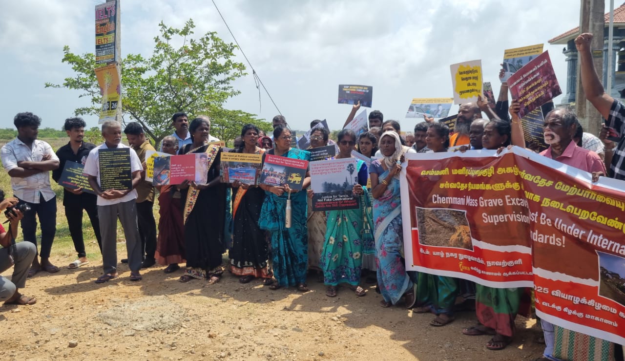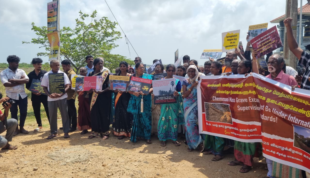 போராட்டத்தில் ஈடுபட்டவர்கள் பதாகைகளை தாங்கி “செம்மணி புதை குழிக்கு நீதி வேண்டும், மறைக்காதே மறைக்காதே புதை குழிக்குளை மறைக்காதே, எங்கே எங்கே உறவுகள் எங்கே, இனப்படுகொலைக்கு சர்வதேச விசாரணை வேண்டும் என கோசமிட்டவாறு போராட்டத்தில் ஈடுபட்டனர்.