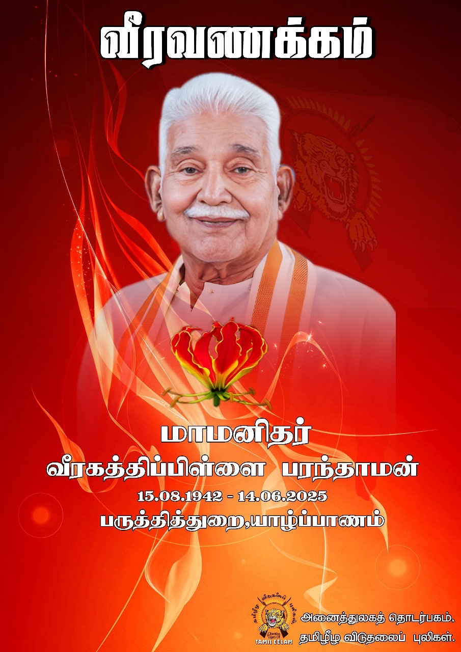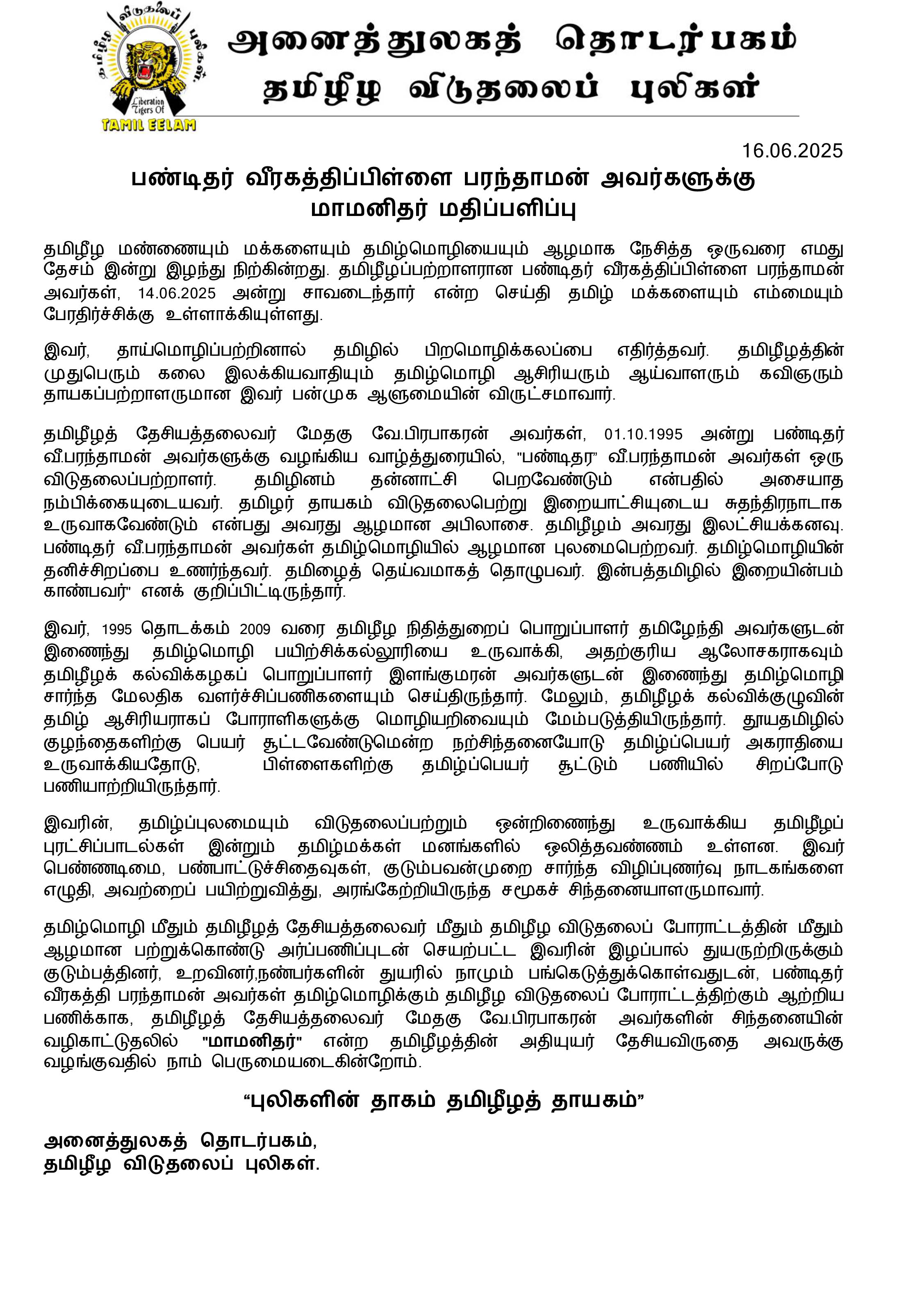 தமிழீழ மண்ணையும் மக்களையும் தமிழ்மொழியையும் ஆழமாக நேசித்த ஒருவரை எமது தேசம் இன்று இழந்து நிற்கின்றது. தமிழீழப்பற்றாளரான பண்டிதர் வீரகத்திப்பிள்ளை பரந்தாமன் அவர்கள், 14.06.2025 அன்று சாவடைந்தார் என்ற செய்தி தமிழ் மக்களையும் எம்மையும் பேரதிர்ச்சிக்கு உள்ளாக்கியுள்ளது.