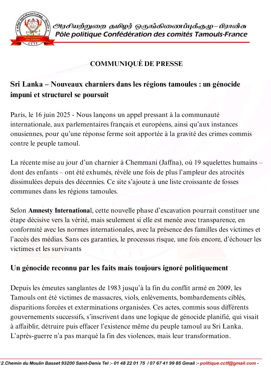 பாரிஸ், ஜூன் 16, 2025இல் – பிரான்சு வாழ் தமிழீழ மக்கள் சார்பாக தமிழர் ஒருங்கிணைப்புக்குழுவின் அரசியல் பிரிவால் பிரெஞ்சு மக்களுக்கும், அரசுக்கும் சர்வதேச சமூகத்திற்கும் ஓர் அவசர வேண்டுகோளைத் தமது COMMUNIQUÉ DE PRESSE ஊடாக விடுத்துள்ளது.