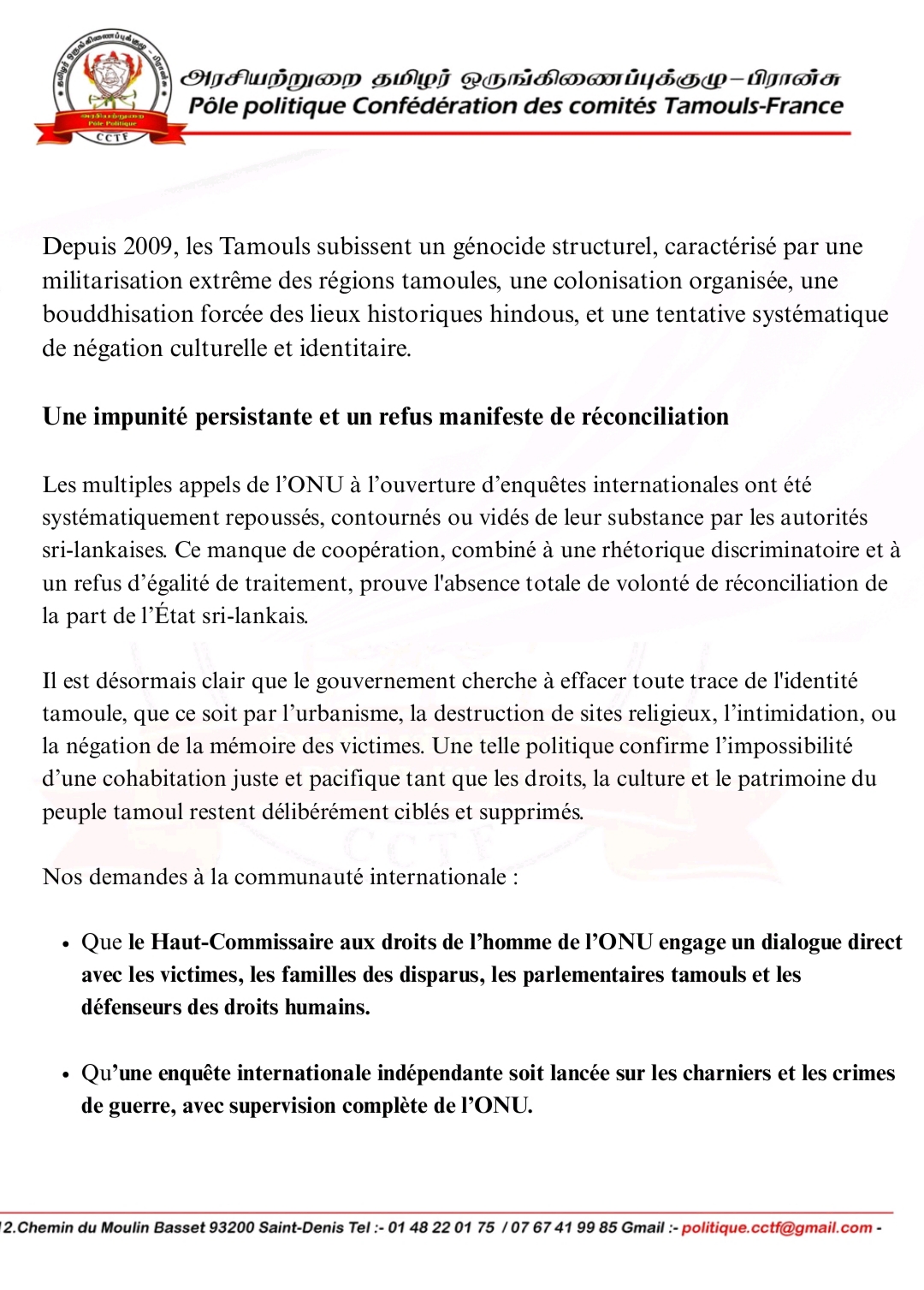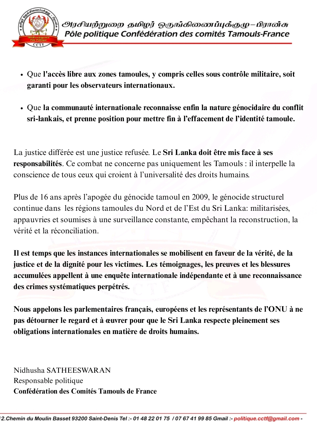 பிரெஞ்சு மற்றும் ஐரோப்பிய பாராளுமன்ற உறுப்பினர்களுக்கும், தமிழ் மக்களுக்கு இழைக்கப்பட்ட குற்றங்களின் தீவிரத்தன்மைக்கு உறுதியான பதிலை உறுதி செய்தல் வேண்டும் என்றும்,. அண்மையில் யாழ்ப்பாணம் செம்மணியில் 19 மனித எலும்புக்கூடுகள் கண்டெடுக்கப்பட்ட பாரிய புதைகுழி –