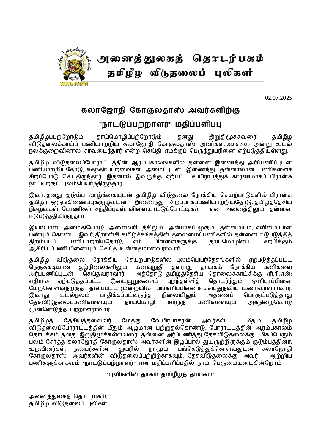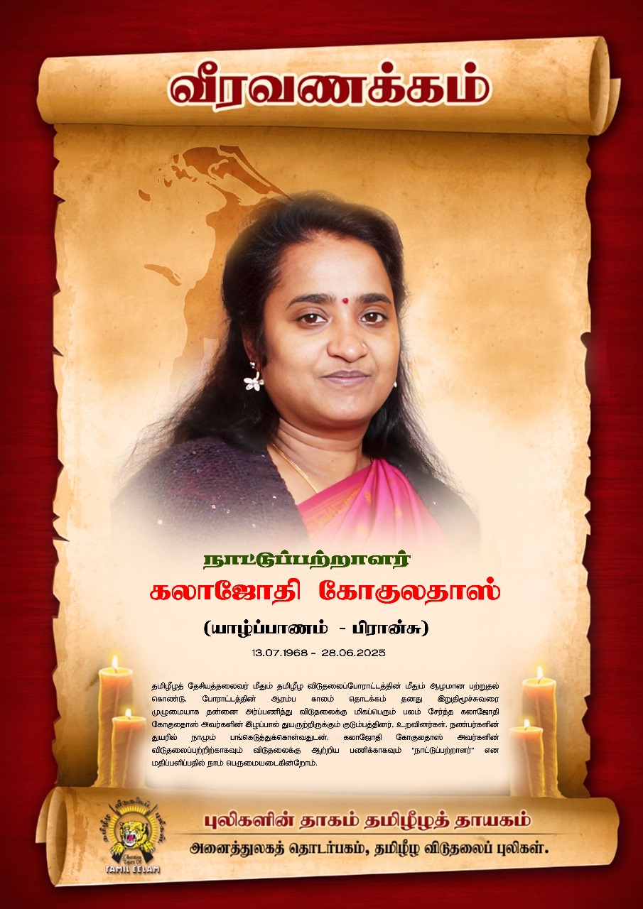 பிரான்சில் கடந்த 28.06.2025 அன்று உடல்நலக்குறைவால் சாவடைந்த கோகுலதாஸ் கலாஜோதி அவர்களுக்கு தமிழீழ விடுதலைப் புலிகளின் அனைத்துலகத் தொடர்பகத்தினால் நாட்டுப்பற்றாளர் என மதிப்பளிக்கப்பட்டுள்ளது.