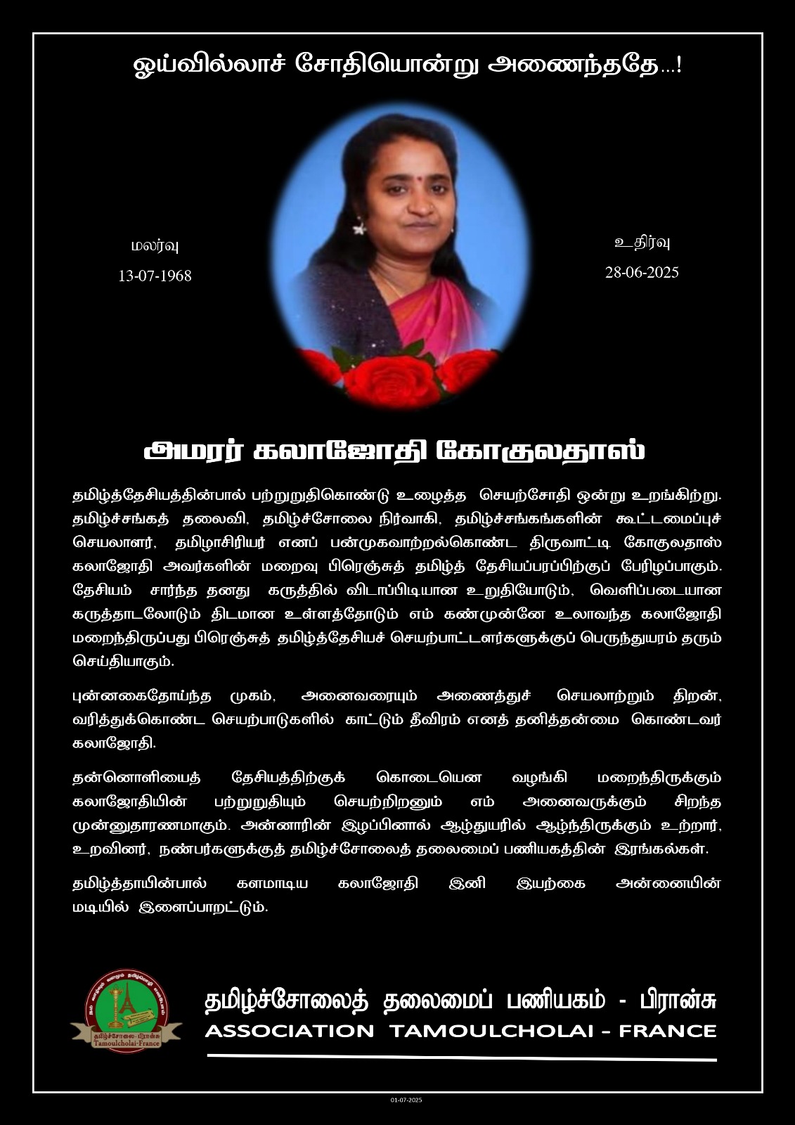 தமிழ்த்தேசியத்தின்பால் பற்றுறுதிகொண்டு உழைத்த செயற்சோதி ஒன்று உறங்கிற்று. தமிழ்ச்சங்கத் தலைவி, தமிழ்ச்சோலை நிர்வாகி, தமிழ்ச்சங்கங்களின் கூட்டமைப்புச் செயலாளர், தமிழாசிரியர் எனப் பன்முகவாற்றல்கொண்ட திருவாட்டி கோகுலதாஸ் கலாஜோதி அவர்களின் மறைவு பிரெஞ்சுத் தமிழ்த் தேசியப்பரப்பிற்குப் பேரிழப்பாகும். தேசியம் சார்ந்த தனது கருத்தில் விடாப்பிடியான உறுதியோடும், வெளிப்படையான கருத்தாடலோடும் திடமான உள்ளத்தோடும் எம் கண்முன்னே உலாவந்த கலாஜோதி மறைந்திருப்பது பிரெஞ்சுத் தமிழ்த்தேசியச் செயற்பாட்டளர்களுக்குப் பெருந்துயரம் தரும் செய்தியாகும்.