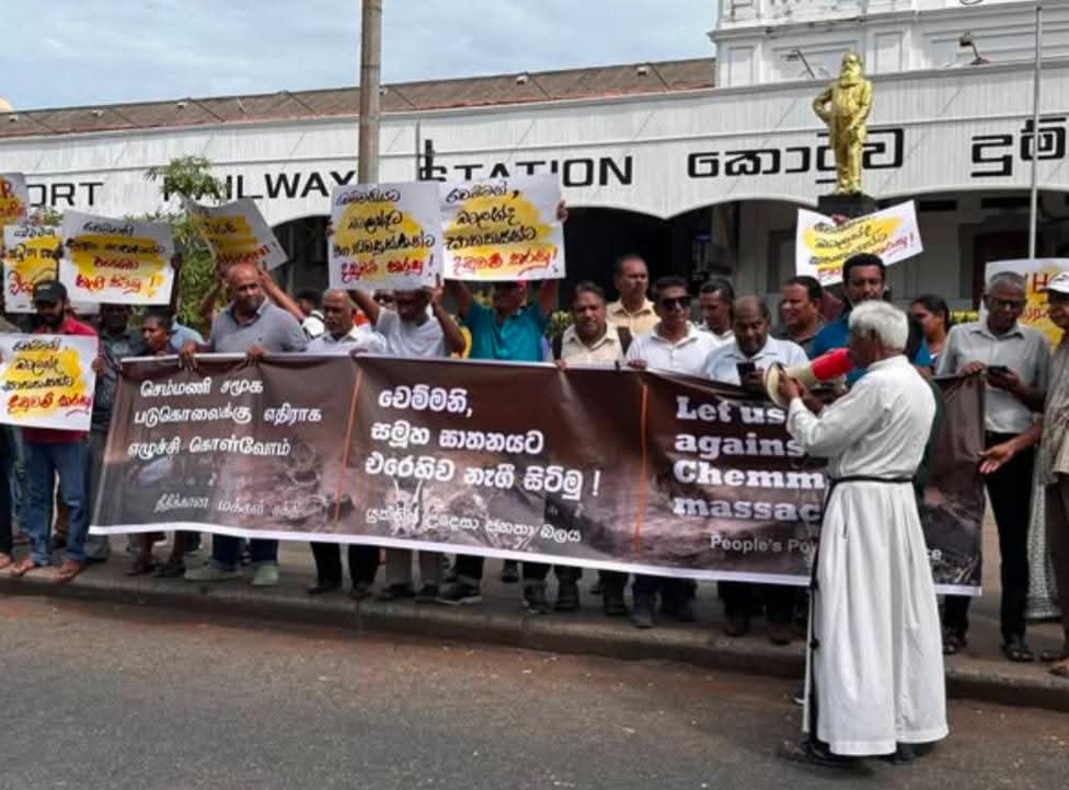இந்த வரலாற்றுப் பின்னணியில், செம்மணி உட்பட அனைத்து மனிதப் புதைகுழிகளுக்கும் நீதிகோரி, நீதிக்கான மக்கள் சக்தி அமைப்பு கொழும்பு கோட்டை புகையிரத நிலையத்திற்கு முன்னால் போராட்டத்திற்கு ஏற்பாடு செய்திருந்தது. “புத்த தேசமா? புதைகுழிகள் தேசமா?”, “செம்மணியில் எலும்புகளாக எம்மவர்கள், சர்வதேசமே தமிழர்களை ஏமாற்றாதே!”, “யுத்த குற்றத்தின் சாட்சி செம்மணி”, “வட கிழக்கில் நில ஆக்கிரமிப்பை நிறுத்து” போன்ற வாசகங்கள் பொறிக்கப்பட்ட பதாதைகளை ஏந்தி, பெருமளவான பொதுமக்கள் போராட்டத்தில் கலந்துகொண்டனர்.