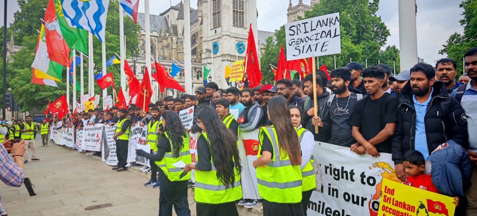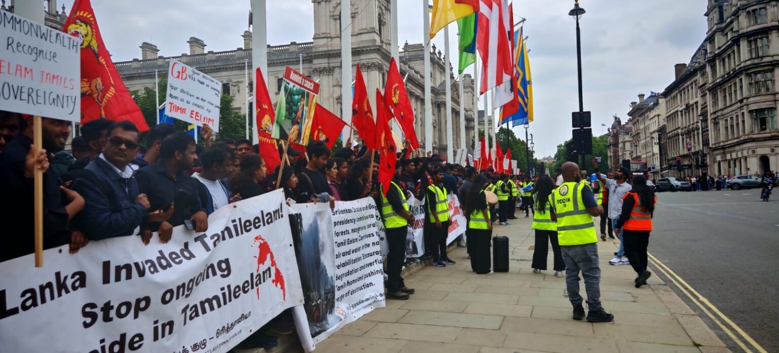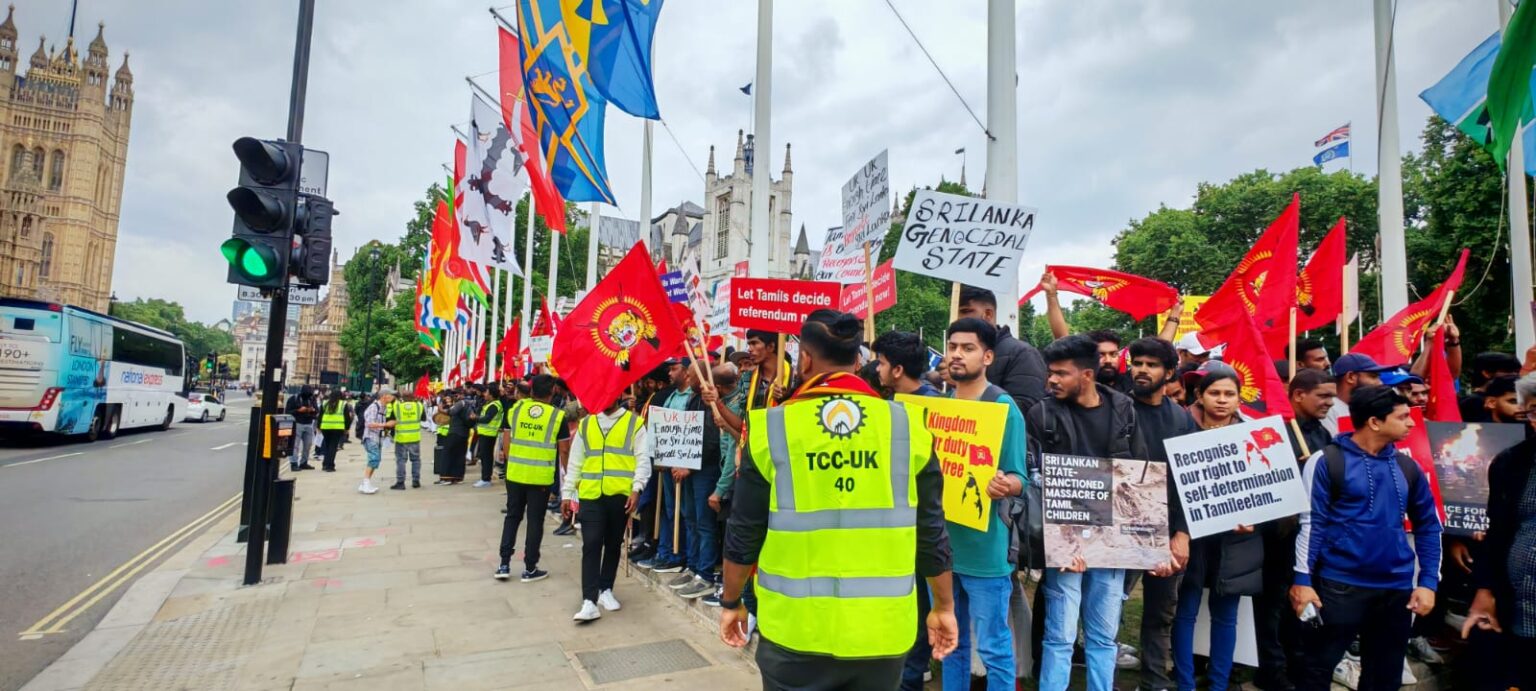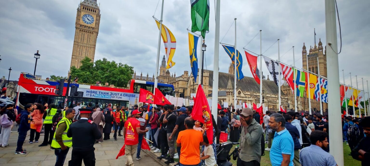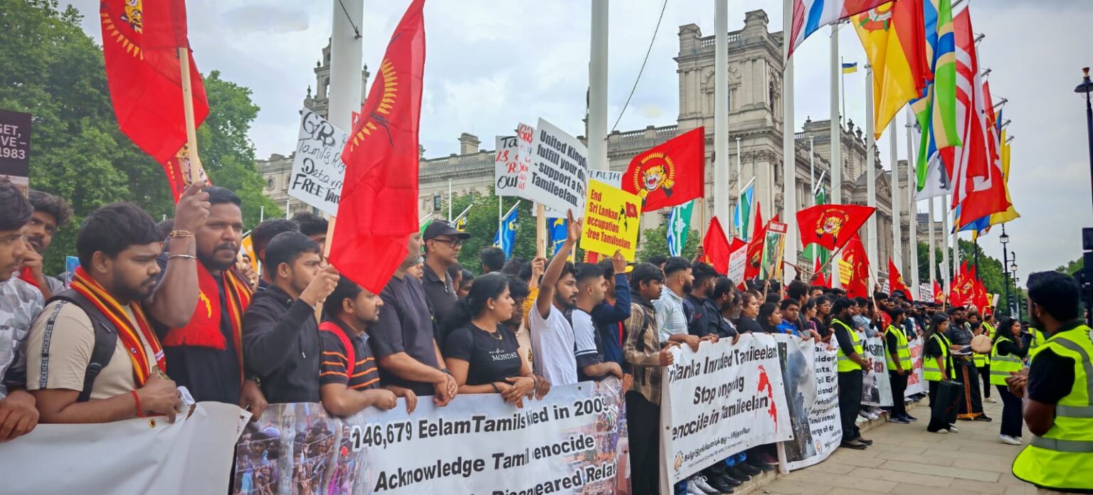 பிரித்தானியாவின் பல்வேறு பகுதிகளில் இருந்தும் திரண்டிருந்த தமிழர்கள், சிறிலங்கா அரசாங்கத்தால் தமிழர்களுக்கு எதிராக நடத்தப்பட்ட வன்முறைகளைக் கண்டித்து முழக்கங்களை எழுப்பினர். குறிப்பாக, ‘கறுப்பு யூலை ‘ என்று அழைக்கப்படும் 1983 ஆம் ஆண்டு ஜூலை மாதம் தமிழர்களுக்கு எதிராக நடத்தப்பட்ட அரச வன்முறைகளின் 42 ஆம் ஆண்டு நிறைவை நினைவுகூரும் வகையில் இந்த நிகழ்வு அமைந்திருந்தது.