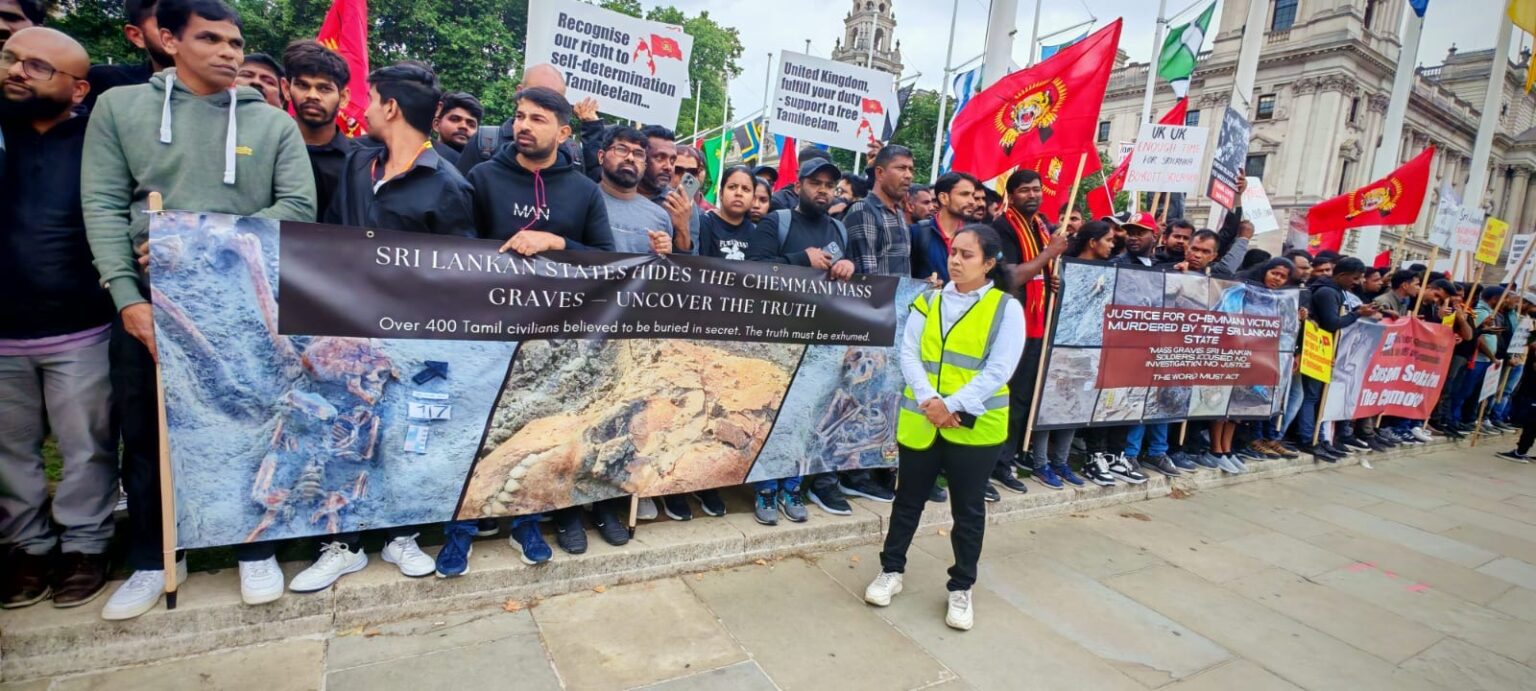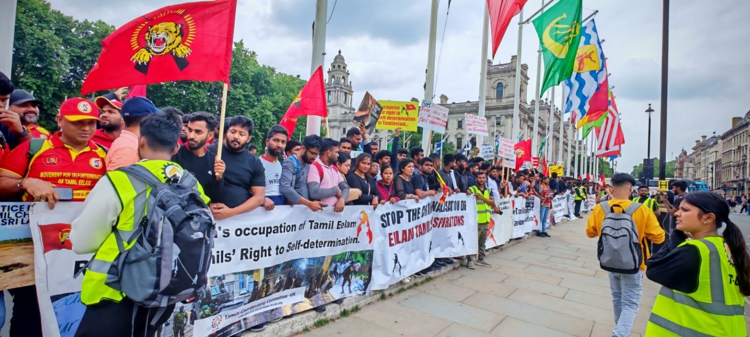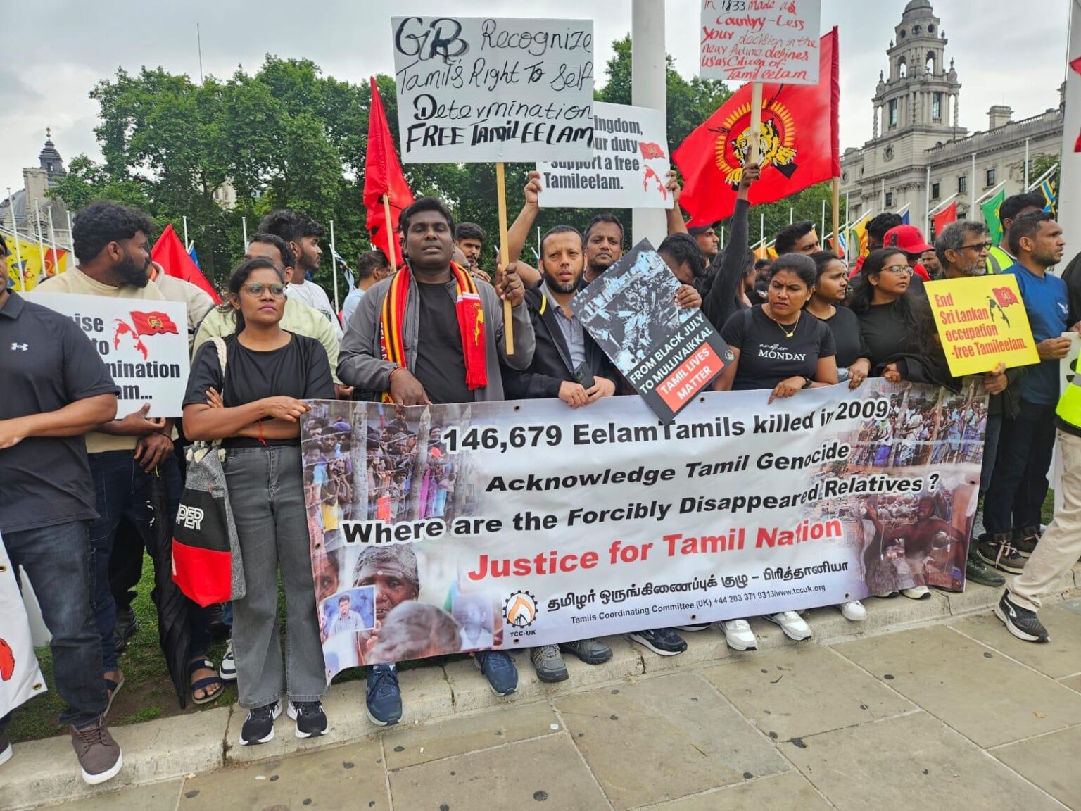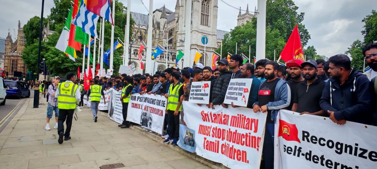 பிரித்தானியாவின் பல்வேறு பகுதிகளில் இருந்தும் திரண்டிருந்த தமிழர்கள், சிறிலங்கா அரசாங்கத்தால் தமிழர்களுக்கு எதிராக நடத்தப்பட்ட வன்முறைகளைக் கண்டித்து முழக்கங்களை எழுப்பினர். குறிப்பாக, ‘கறுப்பு யூலை ‘ என்று அழைக்கப்படும் 1983 ஆம் ஆண்டு ஜூலை மாதம் தமிழர்களுக்கு எதிராக நடத்தப்பட்ட அரச வன்முறைகளின் 42 ஆம் ஆண்டு நிறைவை நினைவுகூரும் வகையில் இந்த நிகழ்வு அமைந்திருந்தது.