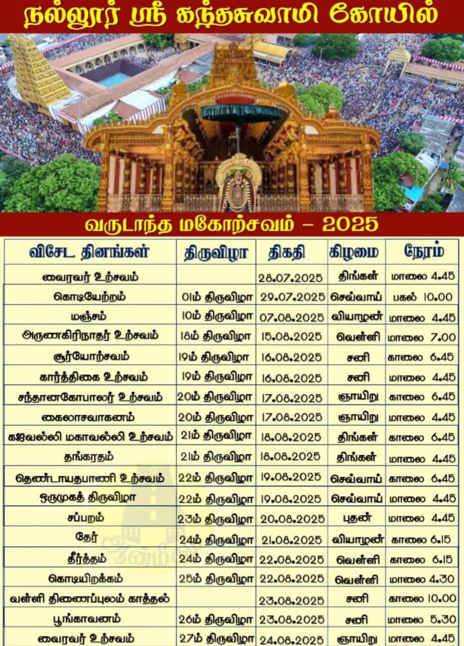 நல்லூர் கந்தசுவாமி கோவிலின் வருடாந்த பெருந்திருவிழா நாளை 29.07.2025 செவ்வாய்க்கிழமை காலை 10 மணிக்கு கொடியேற்றத்துடன் ஆரம்பமாகி தொடர்ந்து 25 நாட்கள் மகோற்சவ திருவிழா நடைபெறவுள்ளது.