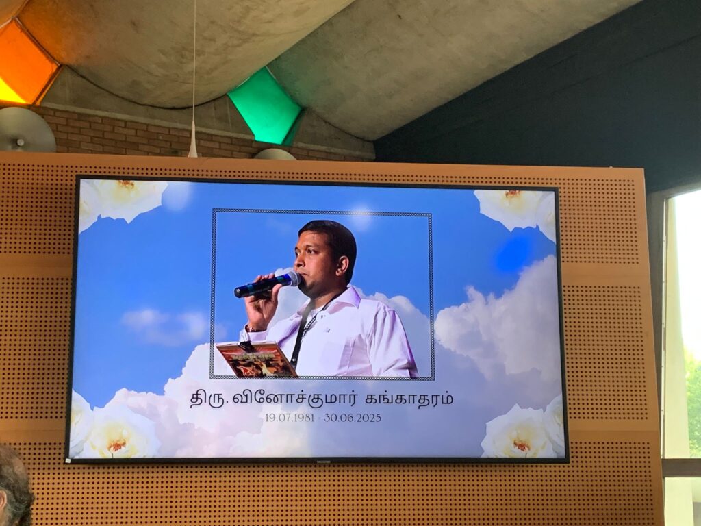 கடந்த 30.06.2025 அன்று பிரான்சு தேசத்தின் பாரிசின் புறநகர் பகுதியில் வாழ்ந்த ஊடகவியலாளர், அறிவிப்பாளர், பேச்சாளர், விடுதலைப்பற்றாளர் அமரர். வினோஜ்குமார் அவர்கள் சாவடைந்திருந்தார். அவரின் இறுதி சடங்கும், வணக்க நிகழ்வும் 31.07.2025 வியாழக்கிழமை வில்தனுஸ் மயான மண்டபத்தில் நடைபெற்றது.