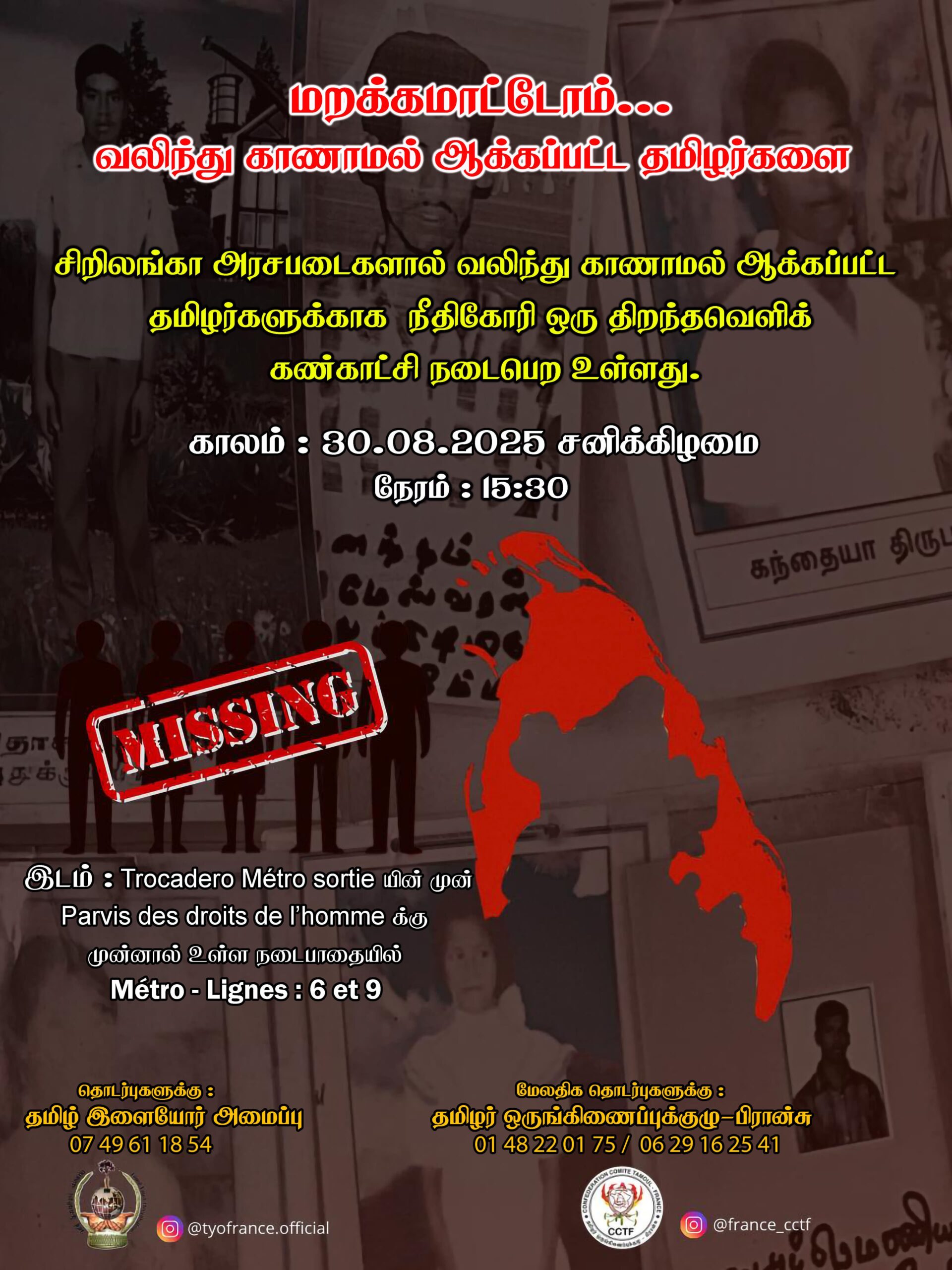 சிறப்பு செய்திகள்புலத்துச்செய்திகள் பிரான்சில் நாளை சர்வதேச காணாமல் ஆக்கப்பட்டோர் நாளில் திறந்த வெளிக் கண்காட்சி! By ஊடகன் - August 29, 2025 0 212 பிரான்சில் நாளை 30.08.2025 சனிக்கிழமை சர்வதேச காணாமல் ஆக்கப்பட்டோர் நாளில் திறந்த வெளிக் கண்காட்சி ஒன்றை பிரான்சு தமிழ் இளையோர் அமைப்பு ஏற்பாடு செய்துள்ளது.