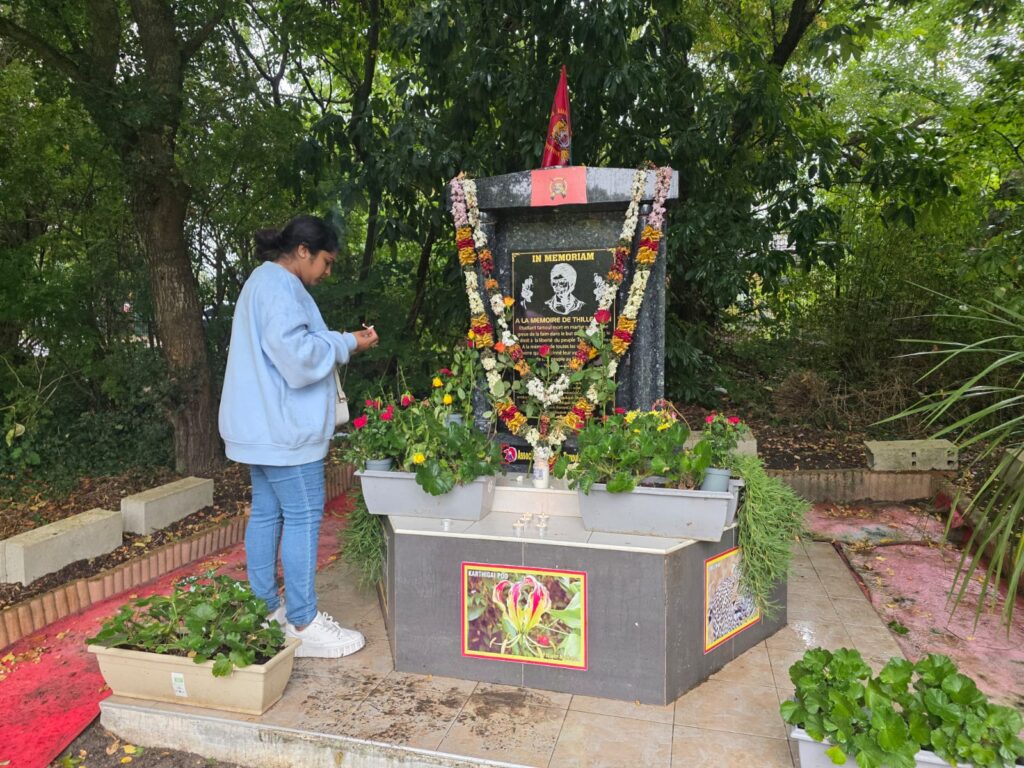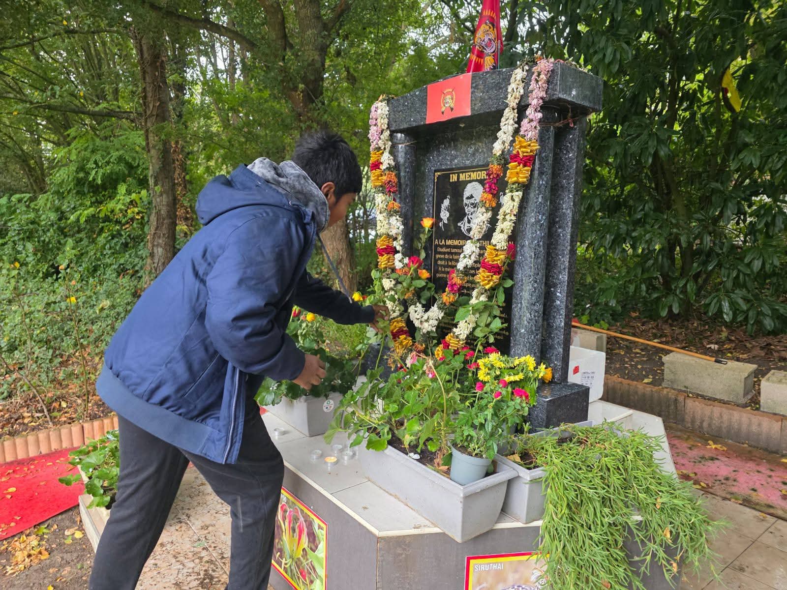 தியாக தீபம் திலீபனின் 38 ஆவது ஆண்டில் அவரது நினைவுகளை சுமந்து 6 ஆவது நாளான இன்று பிரான்சு மண்ணில் தமிழ்ச்சோலைகளில் தியாக தீபனின் திருவுருவப்படத்திற்கு சுடர் ஏற்றி மலர் வணக்கமும் அவரின் ஈகம பற்றிய உரைகள் கவிதைகள் நினைவுகள் பகிரப்பட்டன. கால நிலை மாற்றம் வானமும் கண்ணீர் சிந்தியது போன்று தூறல் மழைக்கு மத்தியில் ஆர்ஜொந்தே நினைவுக்கல்லின் முன்பாக காலை 10.00மணிக்கு சுடர் ஏற்றி வணக்கம் செலுத்தப்பட்டது.