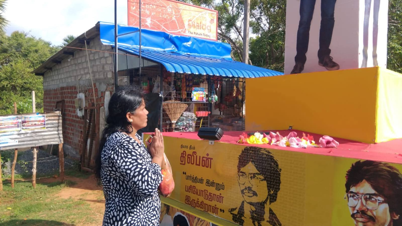 ஊர்தியில் உள்ள திலீபனின் திருவுருவப்படத்திற்கு மக்கள் மலர் தூவி வணக்கம் செலுத்தி வருகின்றனர்.
