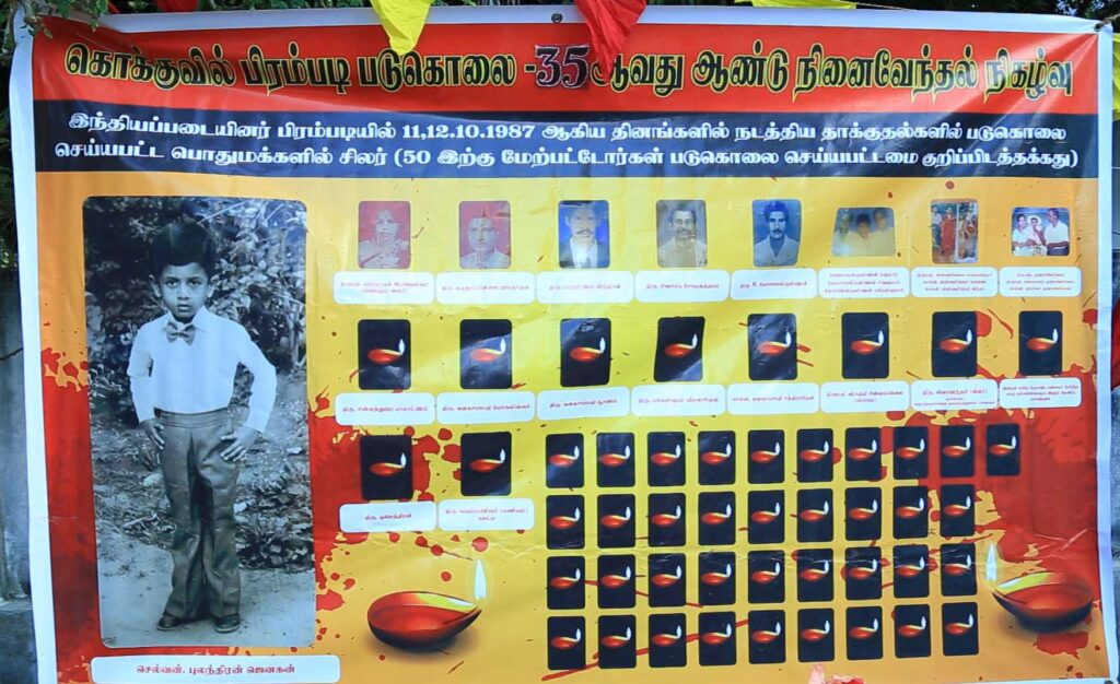 “அன்று சம்பவம் நடக்கும் போது எனக்கு 32 வயது. 1987 ஆம் ஆண்டு ஓக்டோபர் 10 ஆம் திகதி இரவு 7 மணிக்கு பிறகு தான் எங்களுக்கு அதன் தாக்கம் தெரிய வந்தது. விமானங்கள் மேலே சுற்றிய வண்ணம் இருந்தன. சூட்டு சத்தங்கள் கேட்டபடியே இருந்தன. ஏன் இப்படியெல்லாம் நடக்கிறது என்ற காரணம் கூட எங்களுக்கு தெரியவில்லை. இங்குள்ள சிலர் ஊரை விட்டு வெளிக்கிட்டு வேறிடங்களை நோக்கி போனார்கள். ஆனாலும் சிலர் இந்தியன் ஆமி தானே எங்களை ஒன்றும் செய்யாது என்று நம்பியபடியே எங்கும் போகாமல் இருந்தோம்.”