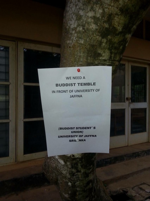யாழ்.பல்கலைக்கழக வளாகத்திற்குள் பெளத்த விகாரை அமைக்கப்பட வேண்டும் எனக்கோரி சுவரொட்டி துண்டு பிரசுரங்கள் ஒட்டப்பட்டுள்ளன.
