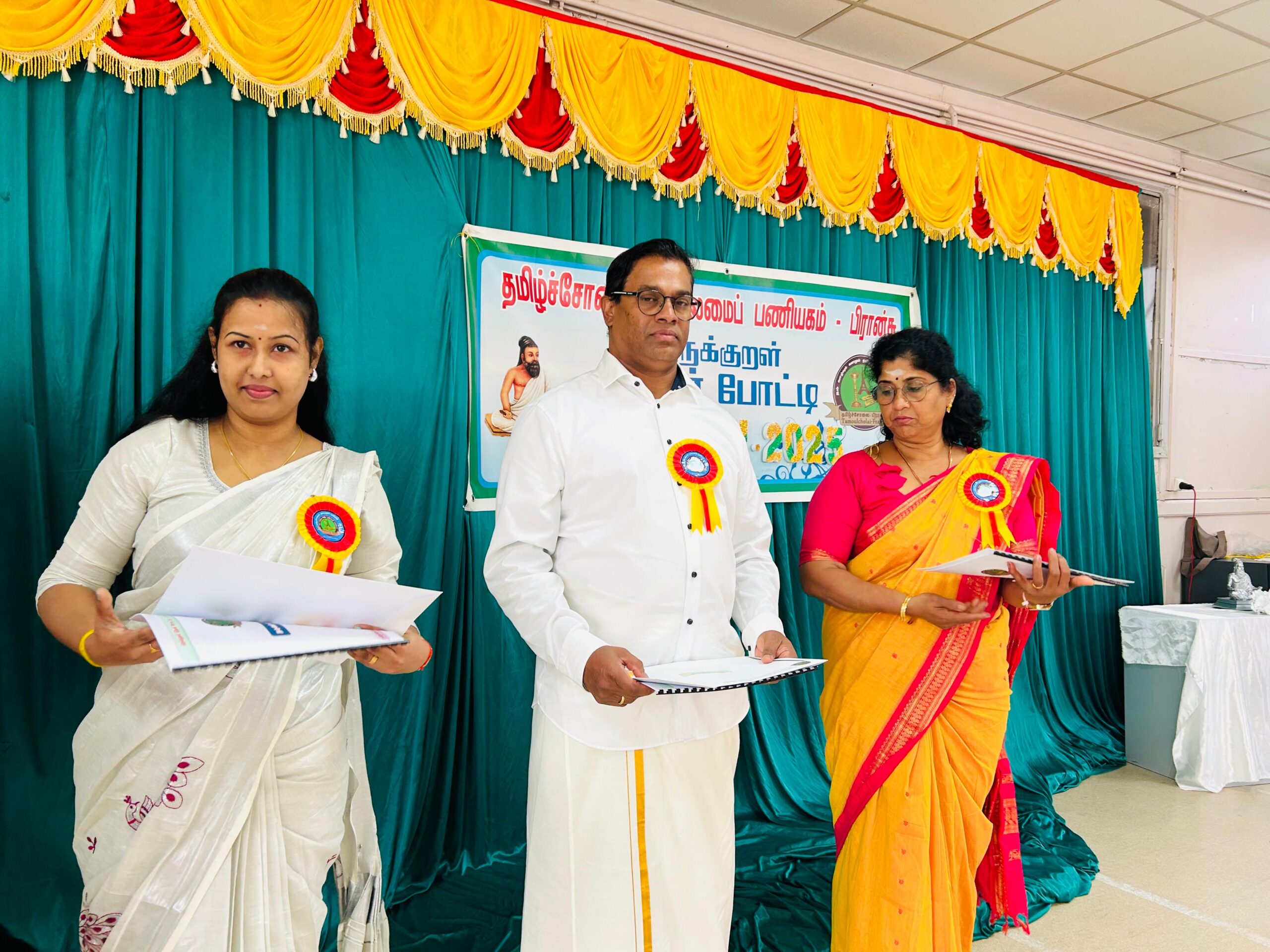 இன்றைய போட்டிகளில் முதல் மூன்று இடங்களினைப் பெற்றவர்களுக்கான வெற்றிக் கேடயங்களும் சான்றிதழ்களும், இறுதிப் போட்டிகளில் பங்குபற்றிய அனைவருக்குமான பதக்கங்களும் சான்றிதழ்களும் 03-01-2026 இல் நடைபெறும் 27வது தமிழ்ச்சோலை முத்தமிழ் விழாவில் வழங்கப்படும்.