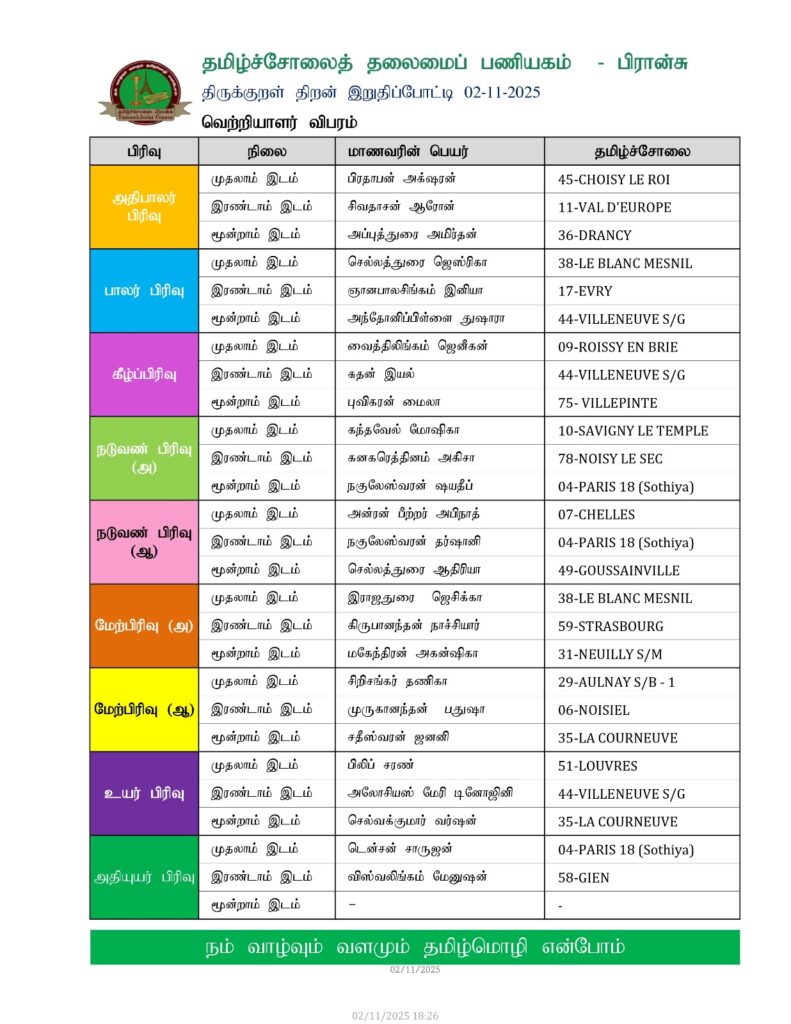 தமிழ்ச்சோலைத் தலைமைப் பணியகத்தின் பிரான்சு தழுவிய திருக்குறள் திறன் இறுதி போட்டிகள் இன்று 02-11-2025 ஞாயிற்றுக்கிழமை திறான்சி (DRANCY) நகரில் சிறப்புற நடந்தேறியது.