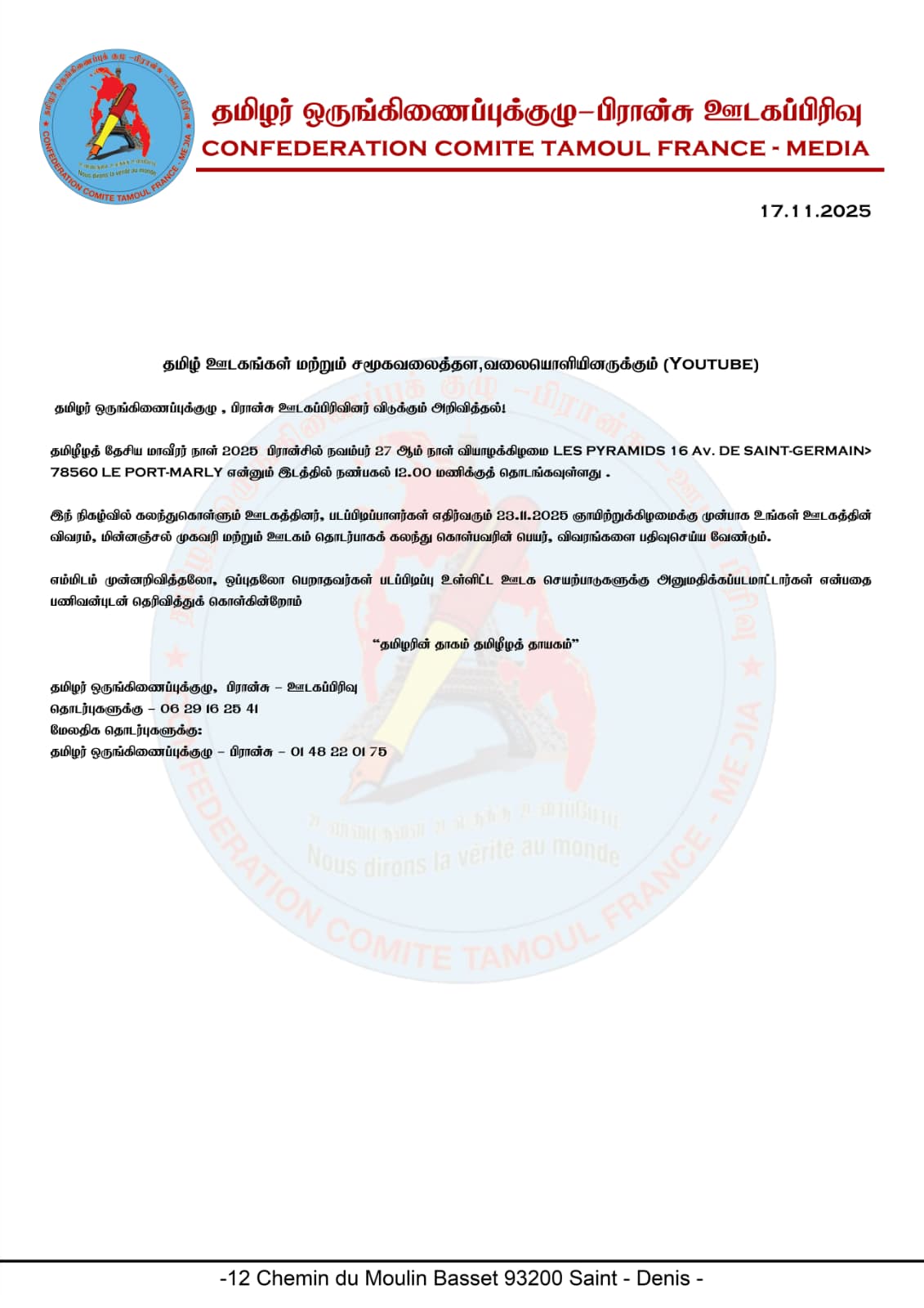 தமிழர் ஒருங்கிணைப்புக்குழு , பிரான்சு ஊடகப்பிரிவினர் அறிவித்தல் ஒன்றை விடுத்துள்ளனர். அதன் முழு விவரம் வருமாறு:-