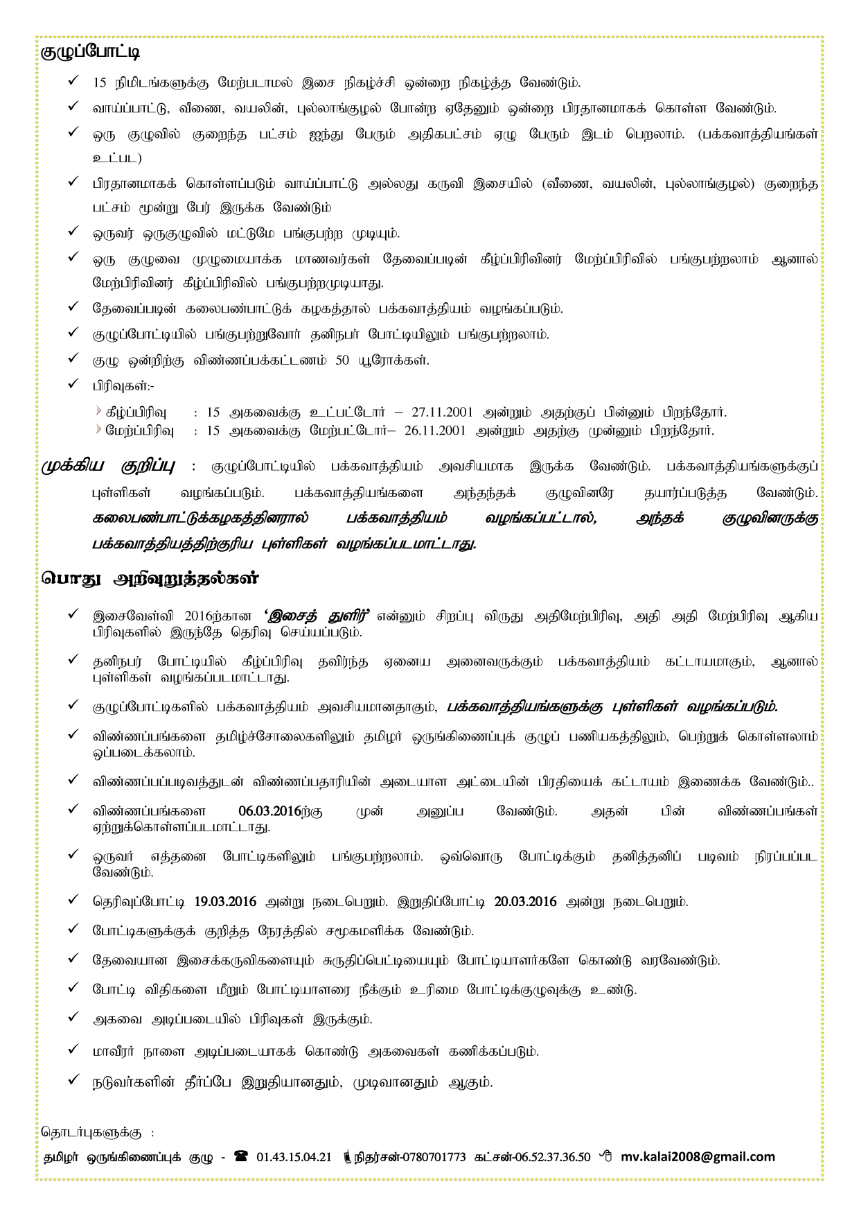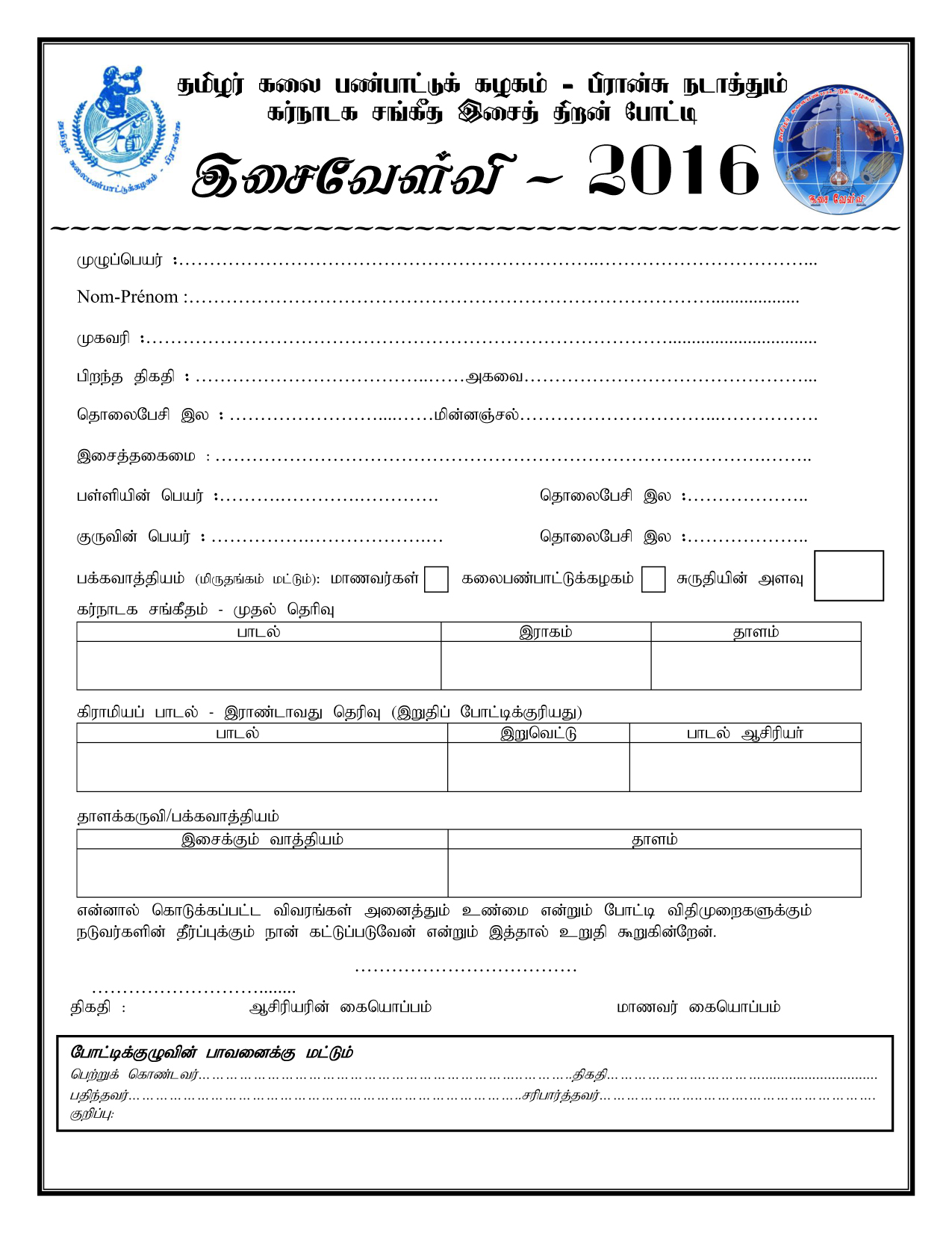 தமிழர் கலை பண்பாட்டுக்கழகம் பிரான்சு வருடாந்தம் நடாத்தும் இசைவேள்வி – 2016 ஆம் ஆண்டுக்கான போட்டி விண்ணப்பங்கள் கோரப்பட்டுள்ளன.