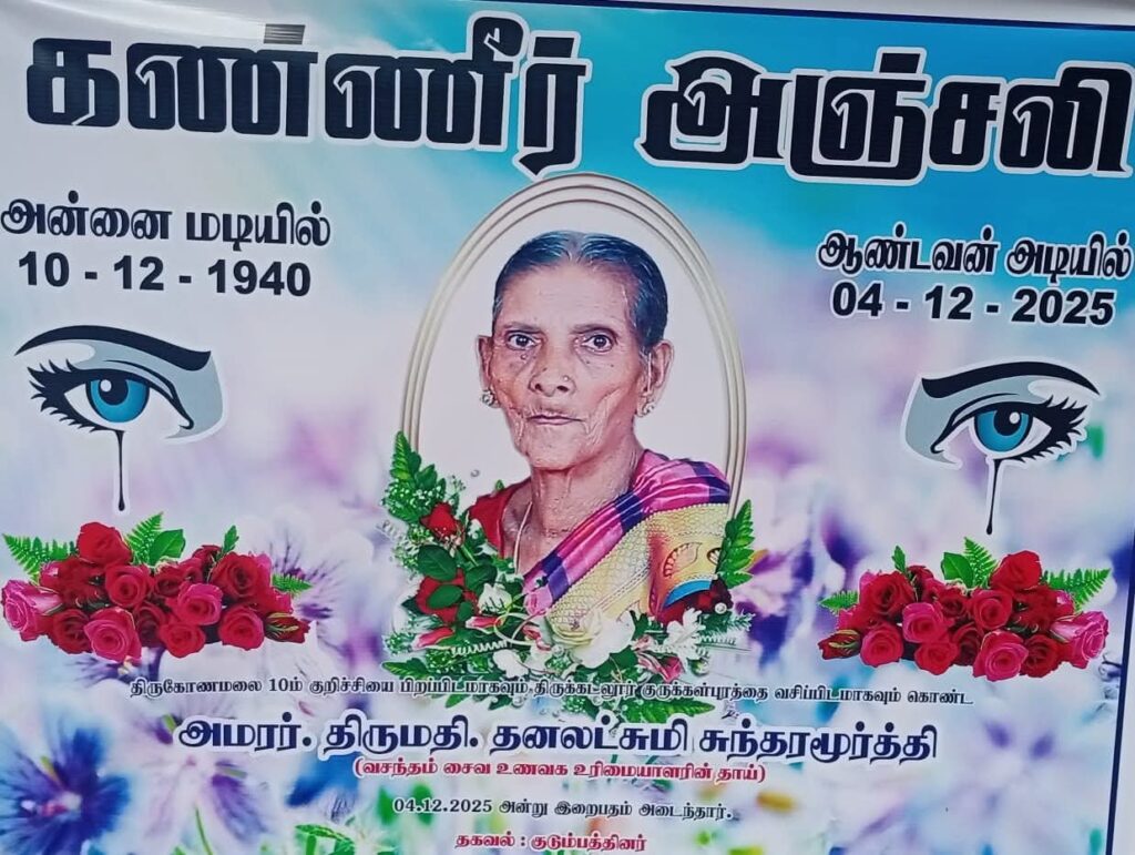 ஈழச்செய்திகள்சிறப்பு செய்திகள் வீரத்தளபதி கேணல் வசந்த் அவர்களின் தாயார் சாவடைந்தார்! By ஊடகன் - December 10, 2025 0 65 இறுதிவரை சமராடிய கேணல் வசந்த் என்ற வீரத்தளபதியை எங்கள் தேசத்திற்காக தந்ததாயார் தனலட்சுமி சுந்தரமூர்த்தி (வயது 85) தாயகத்தில் கடந்த 04.12.2025 வியாழக்கிழமை சாவடைந்துள்ளார். அவரது குடும்பத்தினருக்கு எங்கள் கண்ணீர் வணக்கத்தைத் தெரிவிக்கின்றோம்.