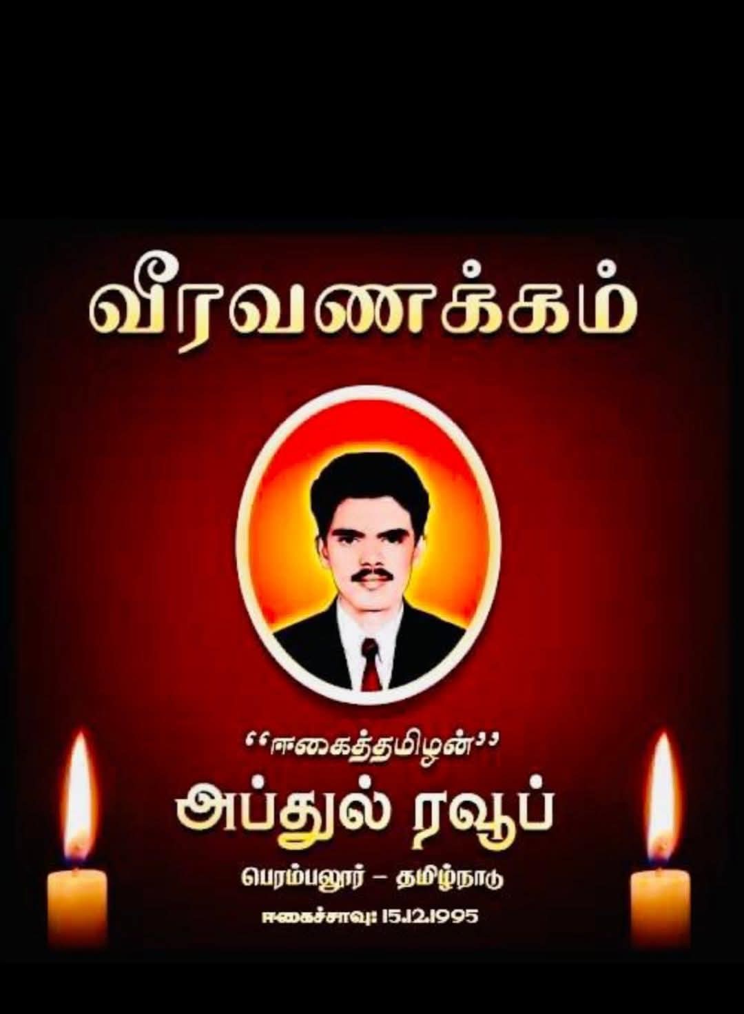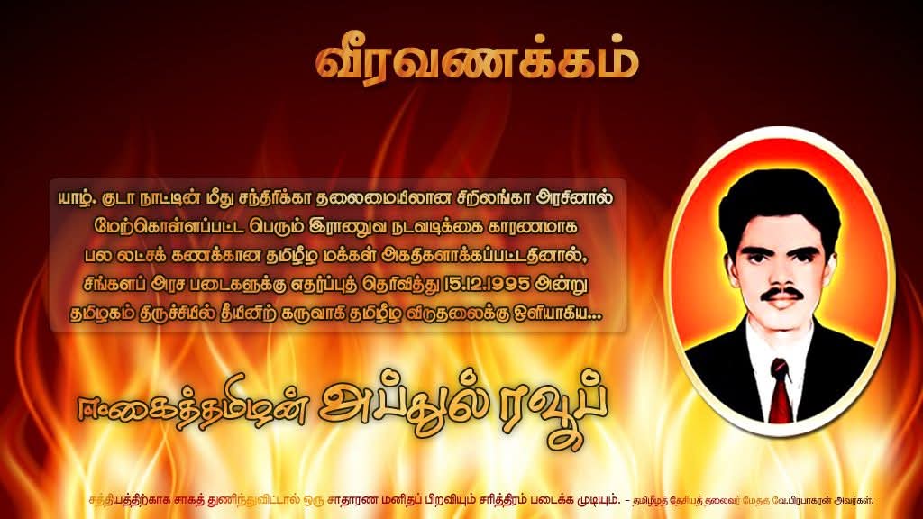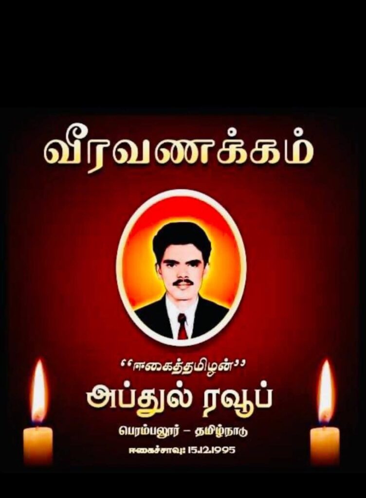 யாழ். குடாநாட்டின் மீது சந்திரிகா தலைமையிலான சிறிலங்கா அரசினால் மேற்கொள்ளப்பட்ட பெரும் படையெடுப்பினால் பல இலட்சக்கணக்கான மக்கள் அகதிகளாக்கப்பட்டதனால் துயருற்ற அப்துல் ரவூப் அவர்கள் எமதுமக்களின் விடியலுக்காக தமிழகம் திருச்சியில் 15.12.1995 அன்று தீக்குளித்து ஈகைச்சாவைத் தழுவிக்கொண்ட “ஈகைத்தமிழன்” அப்துல் ரவூப் அவர்களின் 30 ஆம் ஆண்டு வீரவணக்க நாள் இன்றாகும்.
