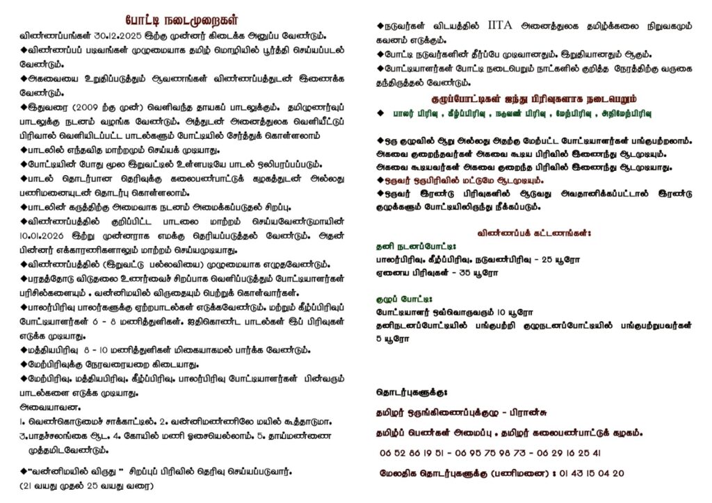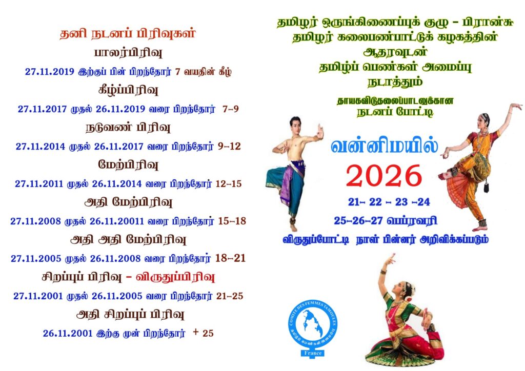 பிரான்சு தமிழர் ஒருங்கிணைப்புக்குழு தமிழ் பெண்கள் அமைப்பினரால் நடாத்தப்படும் வன்னிமயில் 2026 இற்கான நடனம் போட்டிக்கான விண்ணப்பங்களை எதிர்வரும் 31.12.2025 வரை விண்ணப்பிக்கலாம் என வன்னிமயில். நடனப் போட்டி ஏற்பாட்டாளர்கள் அறிவித்துள்ளனர்.