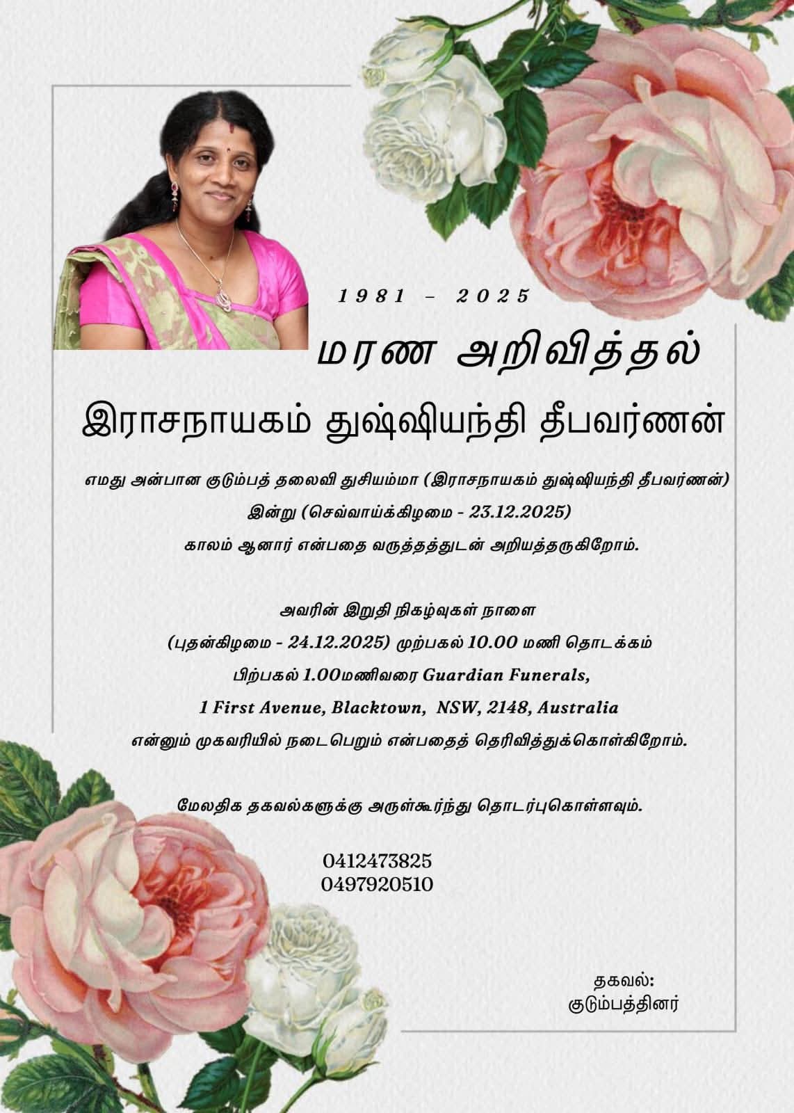தமிழீழ விடுதலைப்புலிகளின் கடற்புலிகள் மகளிர் படையணியில் தேசவிடுதலைக்காக பல களங்கள் கண்டு, பல்துறை பணிகளிலும் இறுதிவரை பயணித்த மகளிர் போராளி வைதேகி (இராசநாயகம் துசியந்தி தீபவர்ணன்) (வயது 44) அவர்கள் 23.12.2025 சுகயீனம் காரணமாக ஆஸ்திரேலியாவில் சாவடைந்துள்ளார்.