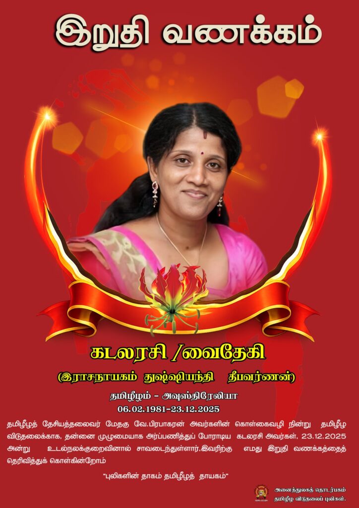 தமிழீழத் தேசியத்தலைவர் மேதகு வே.பிரபாகரன் அவர்களின் கொள்கைவழி நின்று தமிழீழ விடுதலைக்காக, தன்னை முழுமையாக அர்ப்பணித்துப் போராடிய கடலரசி அவர்கள், 23.12.2025 அன்று உடல்நலக்குறைவினால் சாவடைந்துள்ளார்,இவரிற்கு எமது இறுதி வணக்கத்தைத் தெரிவித்துக் கொள்கின்றோம்