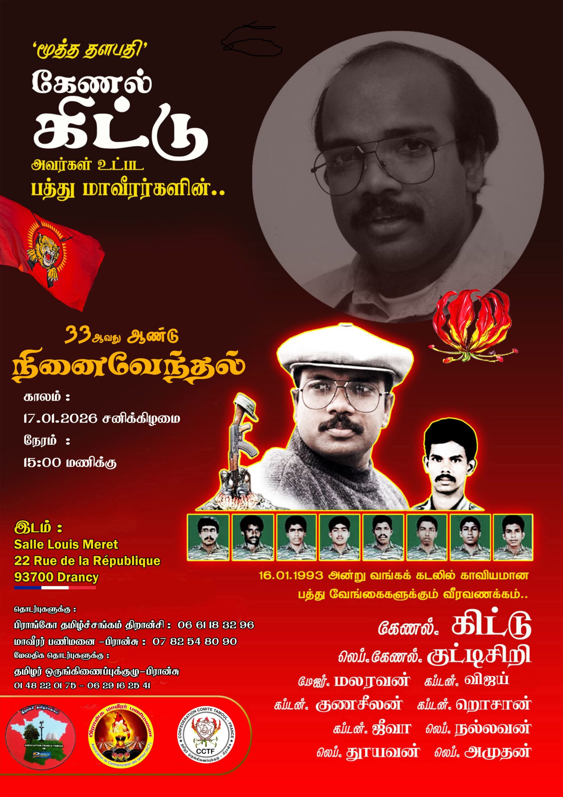 சிறப்பு செய்திகள்புலத்துச்செய்திகள் பிரான்சில் கேணல் கிட்டு உட்பட 10 வீரமறவர்களின் 33 ஆம் ஆண்டு நினைவேந்தல்! By ஊடகன் - January 16, 2026 0 144 பிரான்சில் கேணல் கிட்டு உட்பட 10 வீரமறவர்களின் 33 ஆம் ஆண்டு நினைவேந்தல் நாளை 17.01.2026 சனிக்கிழமை பிற்பகல் 15.00 மணிக்கு திரான்சி நகரில் இடம்பெறவுள்ளது