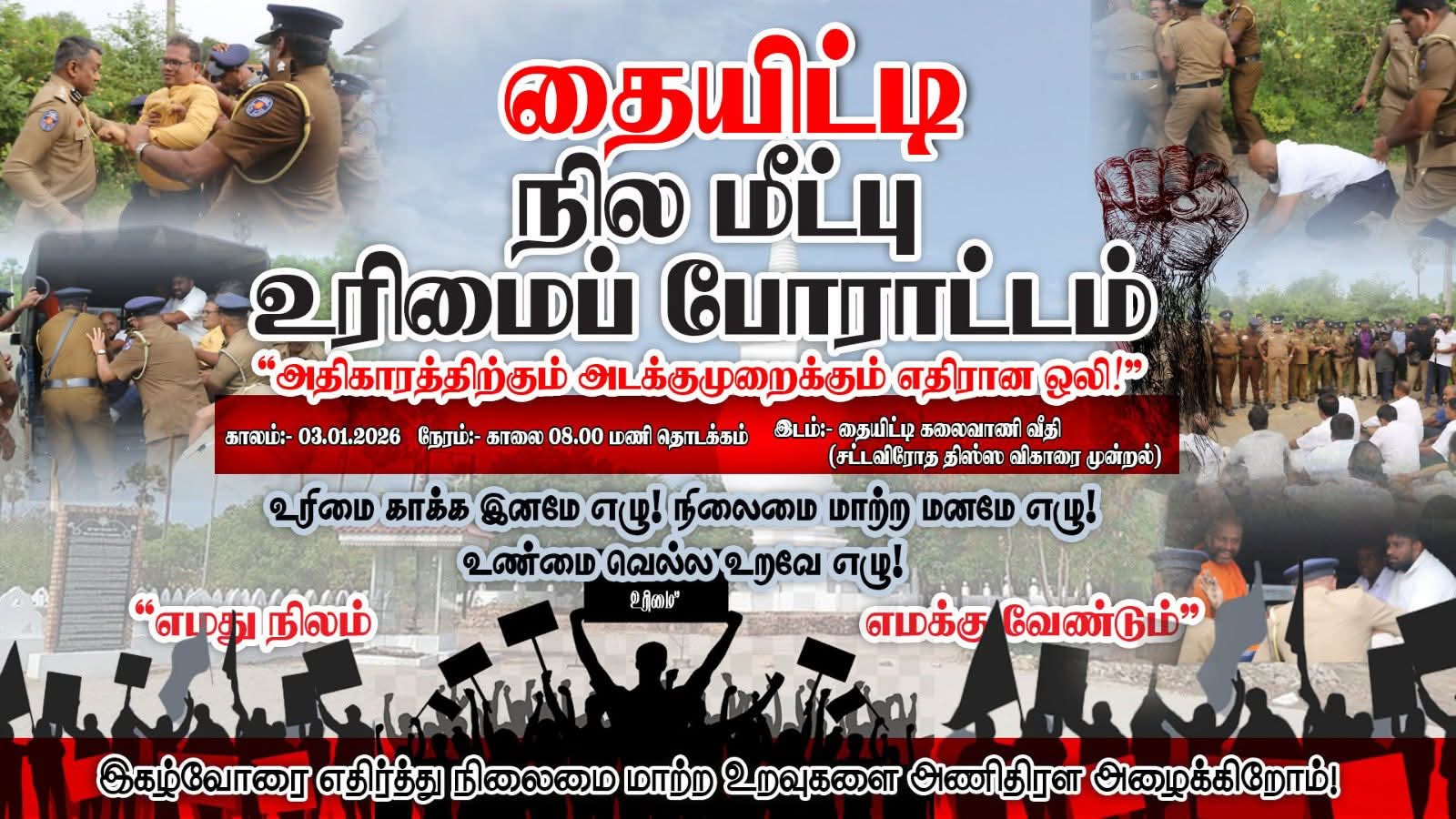 ஈழச்செய்திகள்சிறப்பு செய்திகள் தையிட்டி சட்டவிரோத திஸ்ஸ விகாரைக்கெதிராகத் தொடரும் போராட்டம்! By ஊடகன் - January 2, 2026 0 54 தையிட்டி சட்டவிரோத திஸ்ஸ விகாரைக்கெதிரான போராட்டத்திற்கு நாளை 03.012025 சனிக்கிழமை அழைப்பு விடுத்துள்ள நிலையில் இன்று 02.01.2026 தமிழ்த்தேசிய மக்கள் முன்னணியின் ஏற்பாட்டில் இடம்பெற்றது