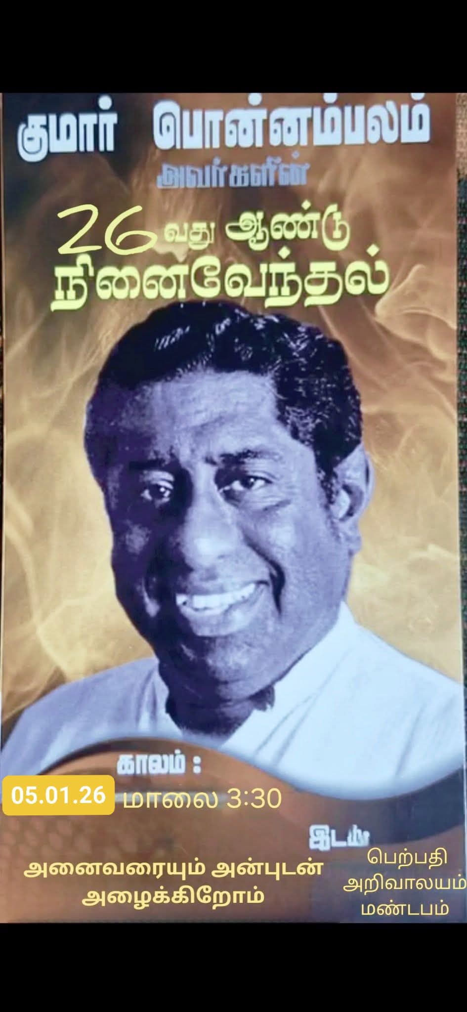 மாமனிதர் குமார் பொன்னம்பலம் ஐயா அவர்களின் இருபத்து ஆறாம் 26ம் ஆண்டு நினைவேந்தல் நிகழ்வு நாளை 05 .01 .2026 திங்கட்கிழமை ன நடைபெறவுள்ளது.