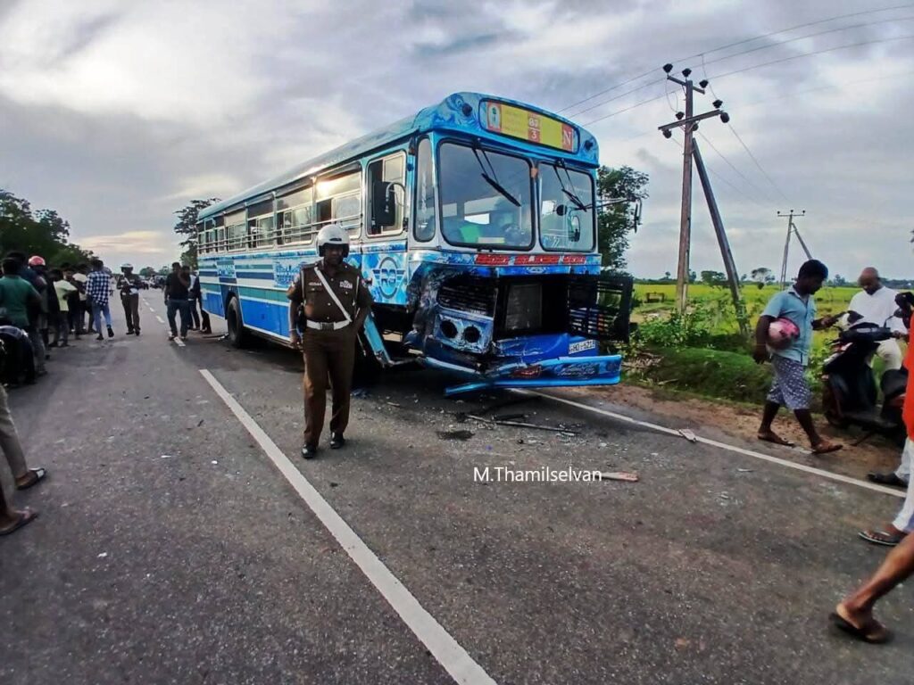 விசுவமடு பகுதியிலிருந்து கிளிநொச்சி நோக்கி பயணித்த மகிழுந்து ஒன்றும், வவுனியாவில் இருந்து விசுவமடு நோக்கி பயணித்த பேருந்தும் நேருக்கு நேர் மோதி விபத்துக்குள்ளானது.