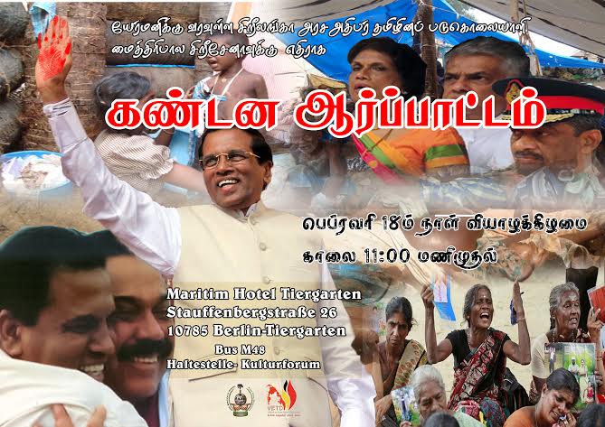 ஆசியா பசுபிக் யேர்மன் வணிக சங்கமும் , யேர்மனியில் உள்ள சிறீலங்கா தூதரகமும் இணைந்து நடாத்தும் ” சிறீலங்கா – யேர்மன் வணிக மன்றத்துக்கு வருகை தர இருக்கும் சிறீலங்கா அரசஅதிபர் தமிழினப்படுகொலையாளி மைத்திரிபால சிறீசேனவை கண்டித்து ஆர்ப்பாடம் எதிர்வரும் 18.02.2016 காலை 11 மணிக்கு பேர்லின் நகரில் நடைபெறவுள்ளது.