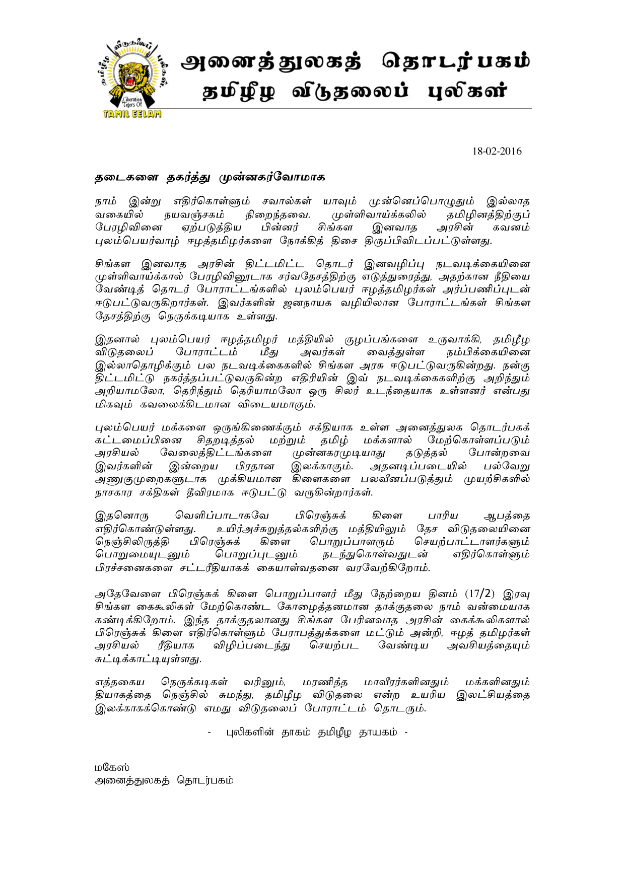 அதேவேளை பிரெஞ்சுக் கிளை பொறுப்பாளர் மீது நேற்றைய தினம் (17/2) இரவு சிங்கள கைகூலிகள் மேற்கொண்ட கோழைத்தனமான தாக்குதலை நாம்வன்மையாக கண்டிக்கிறோம். இந்த தாக்குதலானது சிங்கள பேரினவாத அரசின் கைக்கூலிகளால் பிரெஞ்சுக் கிளை எதிர்கொள்ளும் பேராபத்துக்களைமட்டும் அன்றி, ஈழத் தமிழர்கள் அரசியல் ரீதியாக விழிப்படைந்து செயற்பட வேண்டிய அவசியத்தையும் சுட்டிக்காட்டியுள்ளது.