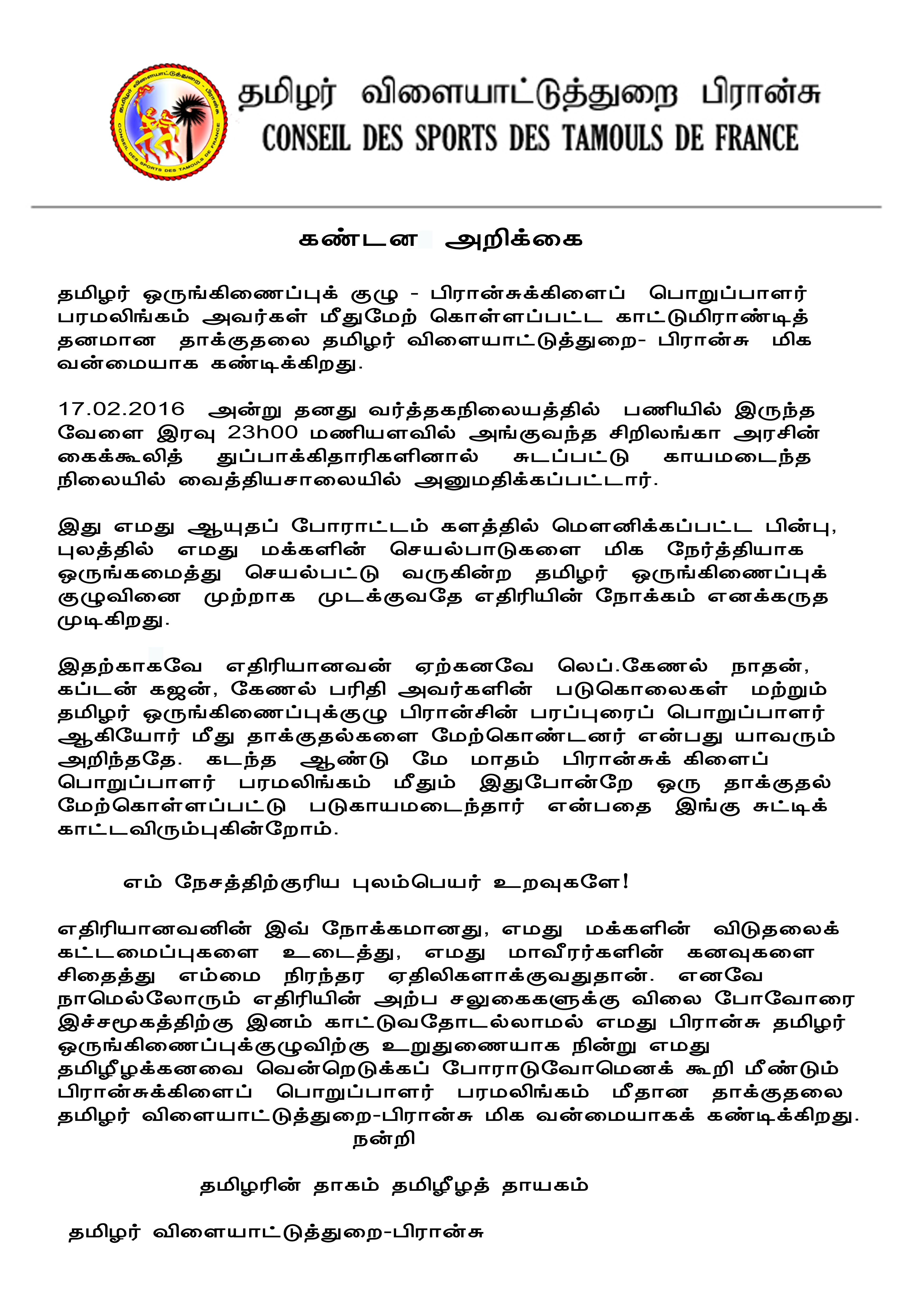 தமிழர் ஒருங்கிணைப்புக்குழு பிரான்சுக்கிளைப் பொறுப்பாளர் பரமலிங்கம் அவர்கள் மீதான காட்டுமிராண்டித் தாக்குதலை தமிழர் விளையாட்டுத்துறை – பிரான்சு மிகவன்மையாகக் கண்டிக்கிறது.