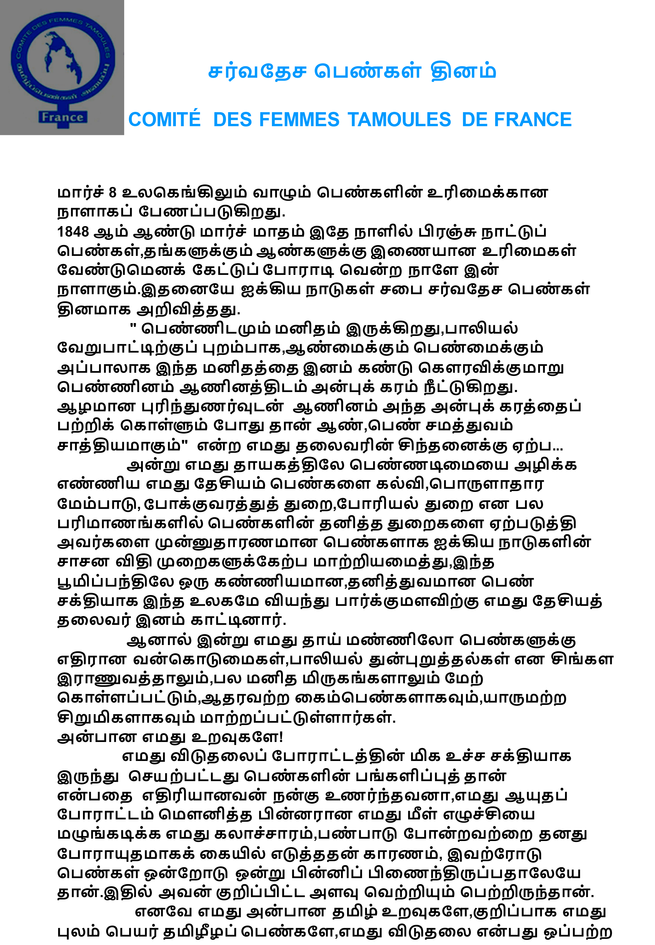 சிறப்பு செய்திகள் விடுதலைப் போராட்டத்தின் உச்ச சக்தி பெண்கள் தான்: பிரான்சு தமிழ் பெண்கள் அமைப்பு By Admin - March 8, 2016 0 221