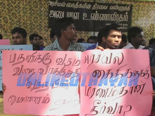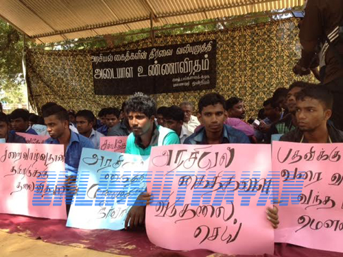 நல்லிணக்க அரசே மௌனம் சாதிப்பது ஏன்?, அனைத்து அரசியல் கைதிகளையும் உடன் விடுதலை செய்!, சிறை வாழ்வுதான் தமிழருக்கு தலைவிதியா?, பதவிக்கு வரும்வரை வாக்குறுதி வந்த பின் மௌனம் ஏன்?, அரசியல் கைதிகளுக்கு மரணம் தான் தீர்வா? போன்ற வாசகங்கள் பொறிக்கப்பட்ட பதாதைகளையும் தாங்கியவாறு அடையாள உண்ணாவிரதத்தை முன்னெடுத்தனர்.