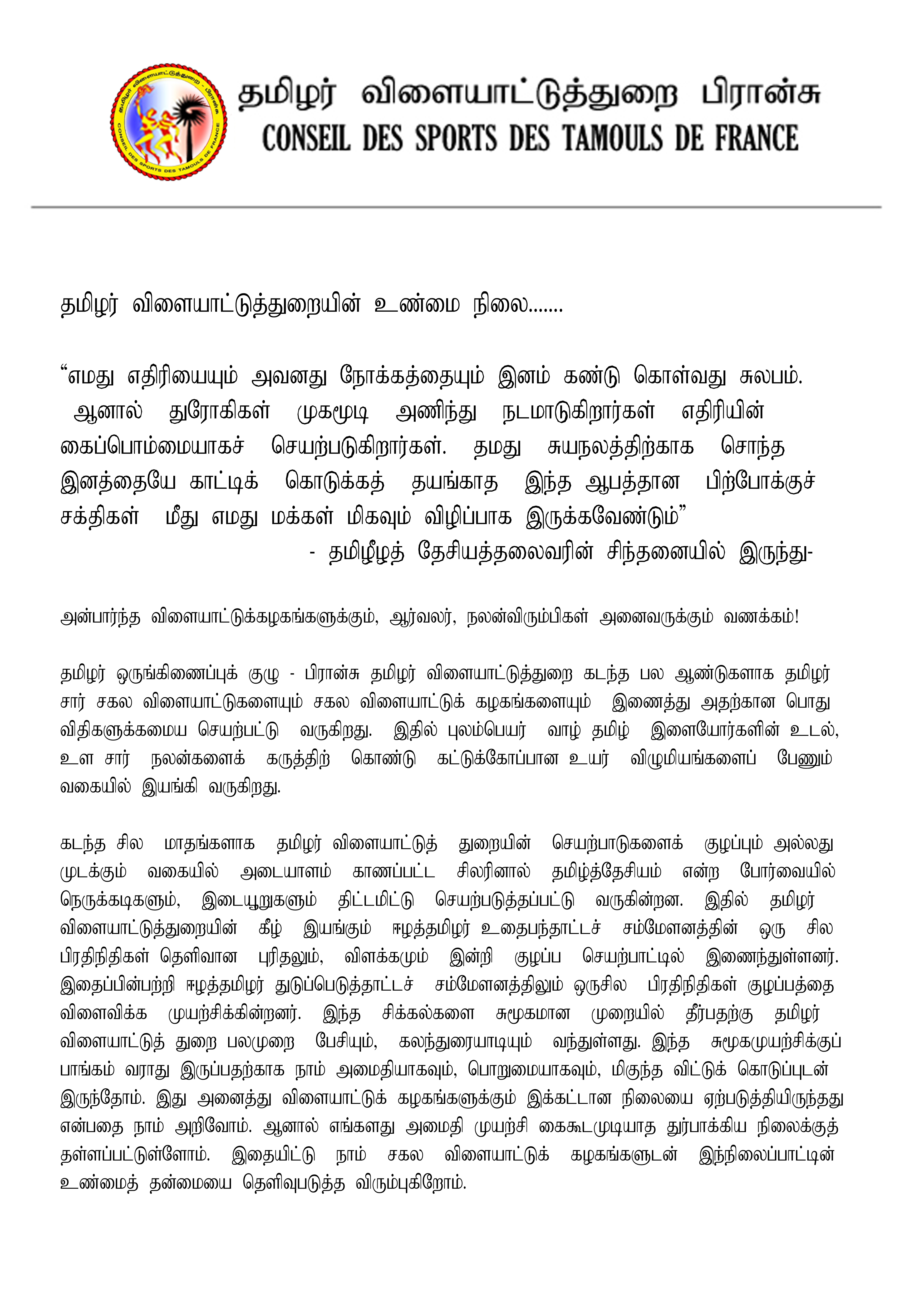 கடந்த சில மாதங்களாக தமிழர் விளையாட்டுத்துறையின் செயற்பாடுகளைக் குழப்பும் அல்லது முடக்கும் வகையில் அடையாளம் காணப்பட்ட சிலரினால் தமிழ்த்தேசியம் என்ற போர்வையில் நெருக்கடிகளும், இடையூறுகளும் திட்டமிட்டு செயற்படுத்தப்பட்டு வருகின்றன. இதில் தமிழர் விளையாட்டுத் துறையின் கீழ் இயங்கும் ஈழத் தமிழர் உதைபந்தாட்டச் சம்மேளனப் பிரதி நிதிகள் தெளிவான புரிதலும், விளக்கமும் இன்றி குழப்ப செயற்பாட்டில் இணைந்துள்ளனர். இதைப்பின்பற்றி ஈழத் தமிழர் துடுப்பெடுத்தாட்டச் சம்மேளனத்திலும் ஒருசில பிரதிநிதிகள் குழப் பத்தை விளைவிக்க முயற்சிக்கின்றனர். இந்த சிக்கல்களை சுமூகமான முறையில் தீர்ப்பதற்கு தமிழர் விளையாட்டுத்துறை பலமுறை பேசியும், கலந்துரையாடியும் வந்துள்ளது. இந்த சுமூக முயற்சிக்குப் பங்கம் வராது இருப்பதற்காக நாம் அமைதியாகவும், பொறுமையாகவும், மிகுந்த விட்டுக் கொடுப்புடன் இருந்தோம். இது அனைத்து விளையாட்டுக் கழகங்களுக்கும் இக்கட்டான நிலையை ஏற்படுத்தியிருந்தது என்பதை நாம் அறிவோம். ஆனால் எங்களது அமைதி முயற்சி கைகூடமுடியாத துர்ப்பாக்கிய நிலைக்குத் தள்ளப்பட்டுள்ளோம். இதையிட்டு நாம் சகல விளையாட்டுக் கழகங்களுடன் இந்நிலைப்பாட்டின் உண்மைத் தன்மையை தெளிவுபடுத்த விரும்புகிறோம்.