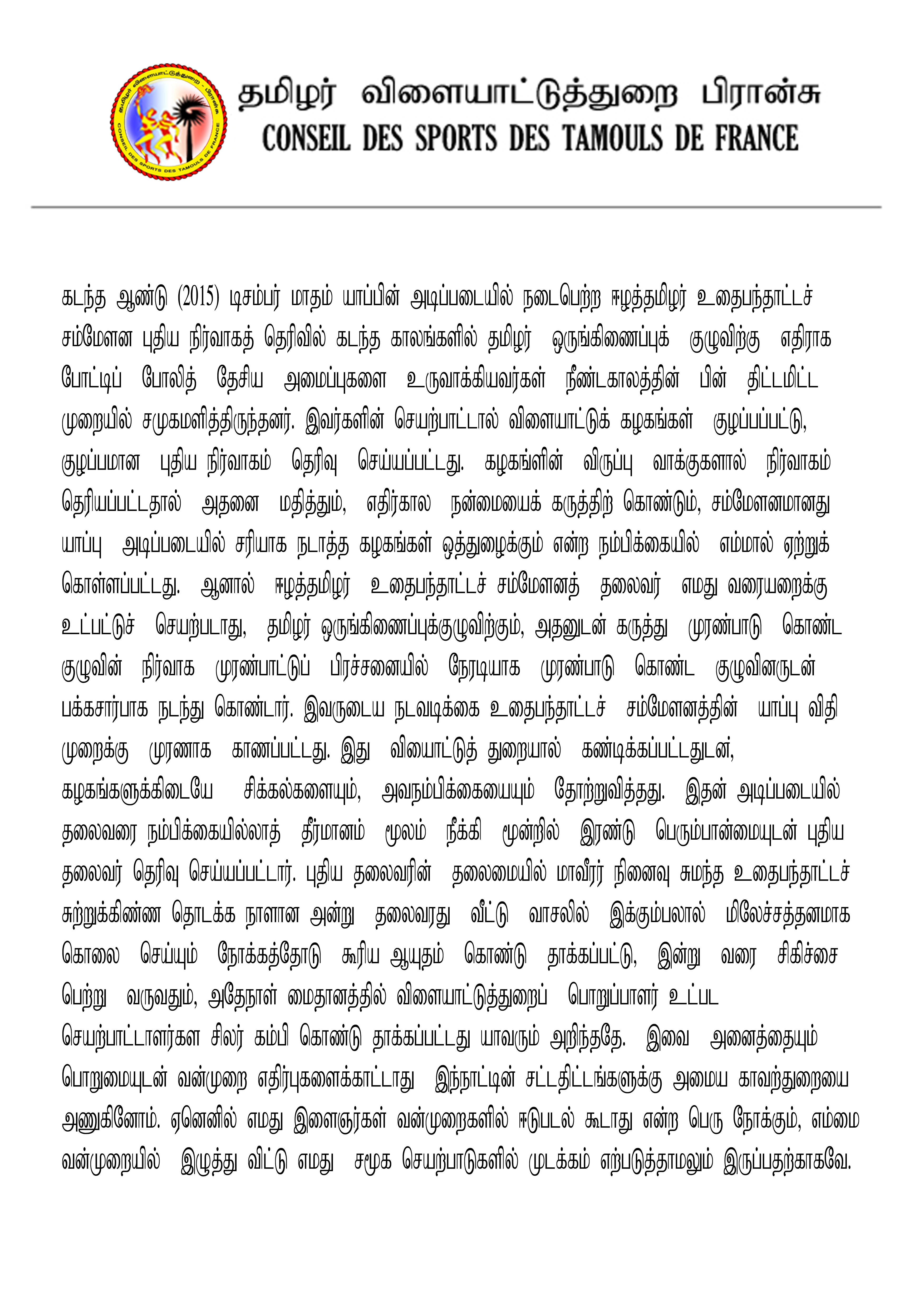 கடந்த ஆண்டு (2015) டிசம்பர் மாதம் யாப்பின் அடிப்படையில் நடைபெற்ற ஈழத்தமிழர் உதைபந்தாட்டச் சம்மேளன புதிய நிர்வாகத் தெரிவில் கடந்த காலங்களில் தமிழர் ஒருங் கிணைப்புக் குழுவிற்கு எதிராக போட்டிப் போலித் தேசிய அமைப்புகளை உருவாக்கியவர்கள் நீண்டகாலத்தின் பின் திட்டமிட்ட முறையில் சமுகமளித்திருந்தனர். இவர்களின் செயற்பாட்டால் விளையாட்டுக் கழகங்கள் குழப்பப்பட்டு, குழப்பமான புதிய நிர்வாகம் தெரிவுசெய்யப்பட்டது. கழகங்களின் விருப்பு வாக்குகளால் நிர்வாகம் தெரியப்பட்டதால் அதனை மதித்தும், எதிர்கால நன்மையைக் கருத்திற்கொண்டும், சம்மேளனமானது யாப்பு அடிப்படையில் சரியாக நடாத்த கழகங்கள் ஒத்துழைக்கும் என்ற நம்பிக்கையில் எம்மால் ஏற்றுக்கொள்ளப்பட்டது. ஆனால் தமிழர் உதைபந்தாட்டச் சம்மேளனத் தலைவர் எமது வரையறைக்கு உட்பட்டுச் செயற்படாது, தமிழர் ஒருங்கிணைப்புக் குழுவிற்கும், அதனுடன் கருத்து முரண்பாடு கொண்ட குழுவின் நிர்வாக முரண்பாட்டுப் பிரச்சனையில் நேரடியாக முரண்பாடு கொண்ட குழுவினருடன் பக்கசார்பாக நடந்துகொண்டார். இவருடைய நடவடிக்கை உதைபந்தாட்டச் சம்மேளனத்தின் யாப்பு விதிமுறைக்கு முரணாக காணப்பட்டது. இது விiயாட்டுத் துறையால் கண்டிக்கப் பட்டதுடன,; கழகங்களுக்கிடையே சிக்கல்களையும், அவநம்பிக்கையையும் தோற்றுவித்தது. இதன் அடிப்படையில் தலைவரை நம்பிக்கையில்லாத் தீர்மானம் மூலம் நீக்கி மூன்றில் இரண்டு பெரும்பான்மையுடன் புதிய தலைவர் தெரிவுசெய்யப்பட்டார். சம்மேளனத்தின் புதிய தலைவரின் தலைமையில் ஏற்பாடுசெய்யப்பட்ட மாவீரர் நினைவுசுமந்த உதைபந்தாட்டச் சுற்றுக்கிண்ண தொடக்க நாளான அன்று, அவரது வீட்டு வாசலில் இக்கும்பலால் மிலேச்சத்தனமாக கொலை செய்யும் நோக்கத்தோடு கூரிய ஆயுதம் கொண்டு தாக்கப்பட்டு, இன்றுவரை சிகிச்சை பெற்று வருவதும், அதேநாள் மைதானத்தில் விளையாட்டுத்துறைப் பொறுப்பாளர் உட்பட செயற்பாட்டாளர்கள் சிலர், கம்பிகொண்டு தாக்கப்பட்டது யாவரும் அறிந்ததே. இவை அனைத் தையும் பொறுமையுடன் வன்முறை எதிர்ப்புகளைக்காட்டாது, இந்நாட்டின் சட்டதிட்டங்களுக்கு அமைய காவற்துறையை அணுகினோம். ஏனெனில், எமது இளைஞர்கள் வன்முறைகளில் ஈடுபடல் கூடாது என்ற பெரு நோக்கும், எம்மை வன்முறையில் இழுத்துவிட்டு எமது சமூக செயற்பாடுகளில் முடக்கம் எற்படுத்தாமலும் இருப்பதற்காகவே.
