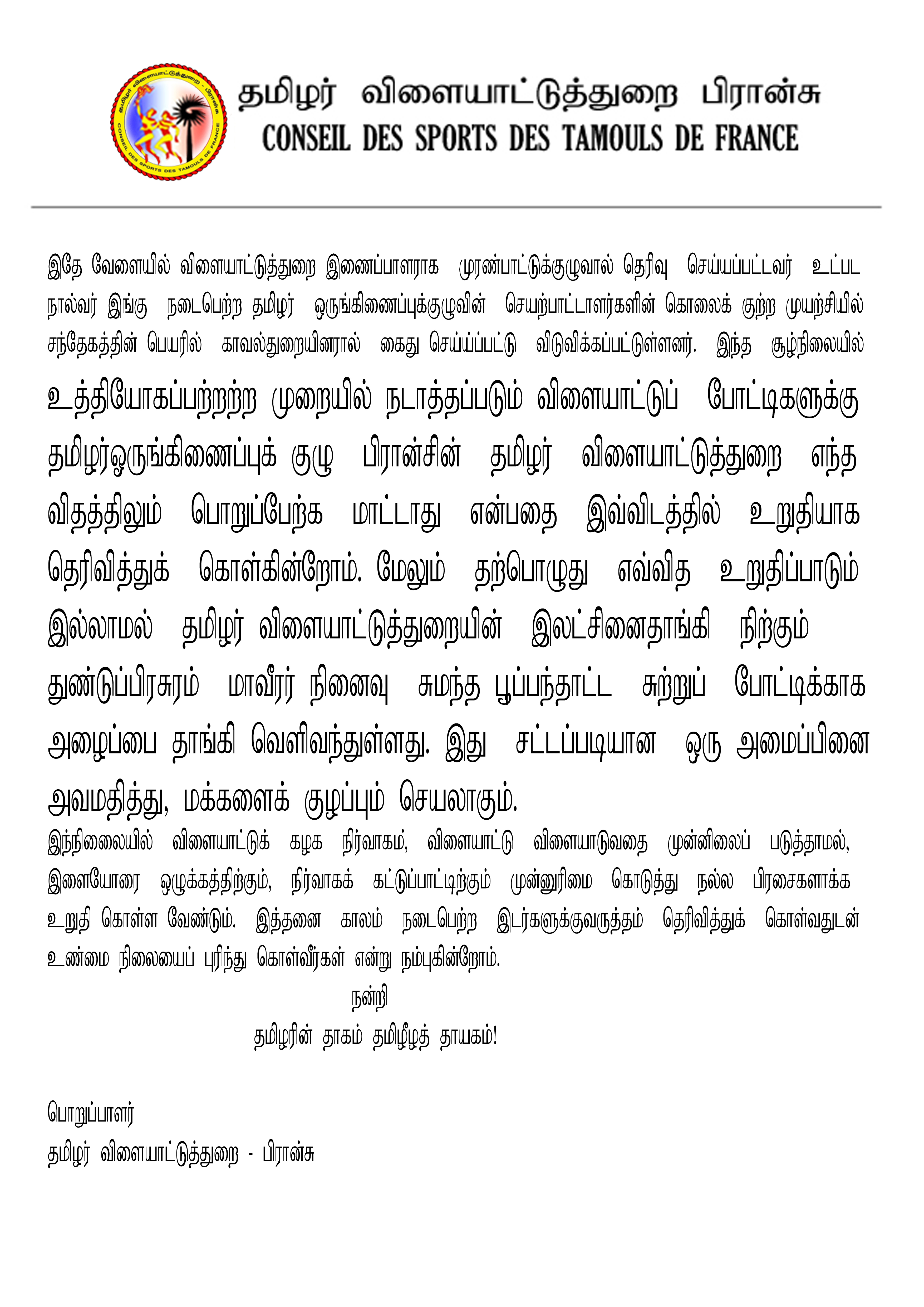 இந்த சூழ்நிலையில் உத்தியோகப் பற்றற்ற முறையில் நடாத்தப்படும் விளையாட்டுப் போட்டிகளுக்கு தமிழர் ஒருங்கிணைப்புக் குழு பிரான்சின் தமிழர் விளையாட்டுத் துறை எந்த விதத்திலும் பொறுப்பேற்க மாட்டாது என்பதை இவ்விடத்தில் உறுதியாக தெரிவித்துக் கொள்கின்றோம். மேலும் தற்பொழுது எவ்வித உறுதிப்பாடும் இல்லாமல் தமிழர் விளையாட்டுத் துறையின் இலட்சினைதாங்கி நிற்கும் துண்டுப்பிரசுரம் மாவீரர் நினைவு சுமந்த பூப்பந்தாட்ட சுற்றுப் போட்டிக்காக அழைப்பை தாங்கி வெளிவந்துள்ளது. இது சட்டப்படியான ஒரு அமைப்பினை அவமதித்து, மக்களைக் குழப்பும் செயலாகும்.