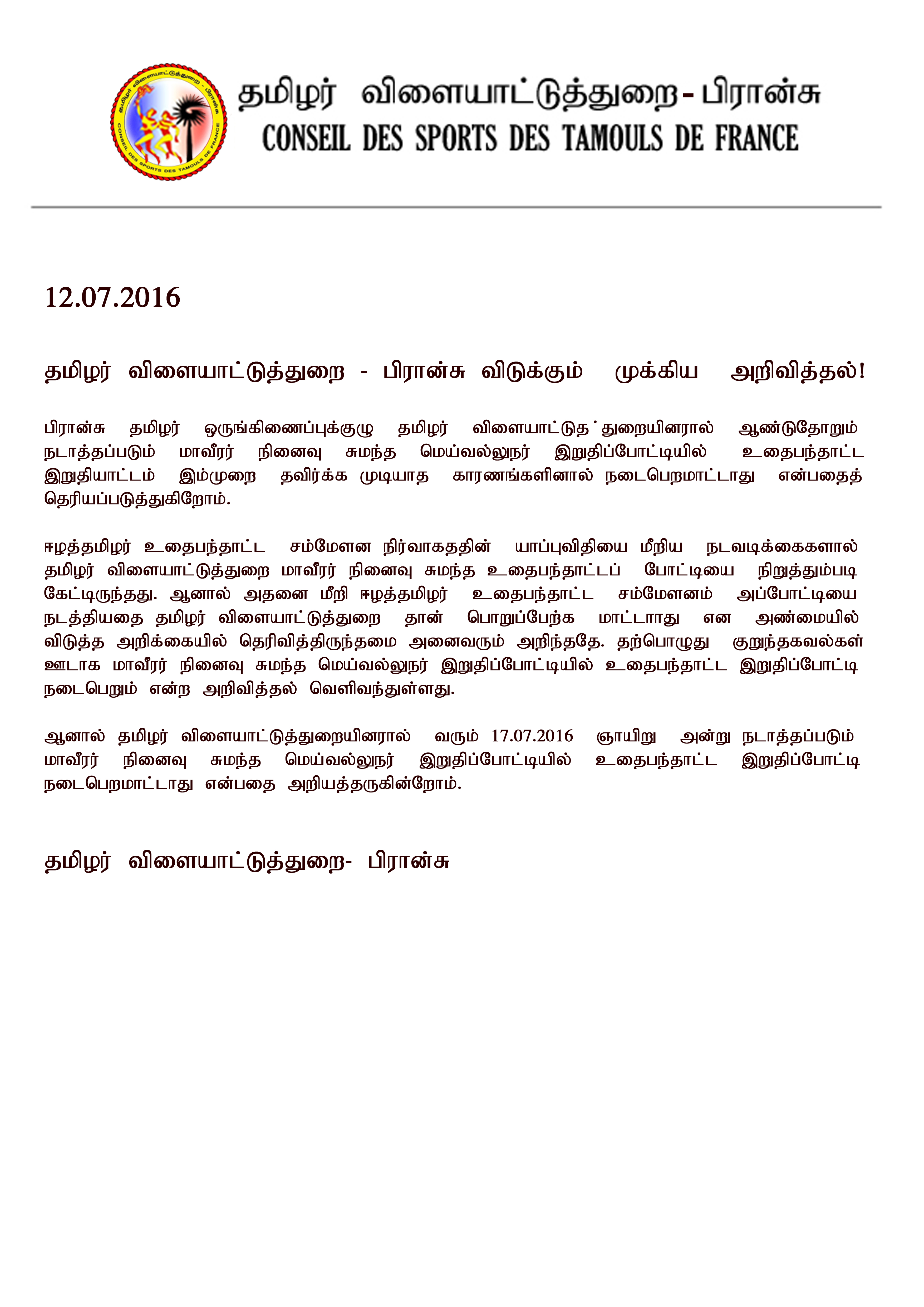 அண்மையில் தமிழர் விளையாட்டுத்துறை பிரான்சு வெளியிட்ட அறிக்கையும் இணைக்கப்பட்டுள்ளது.