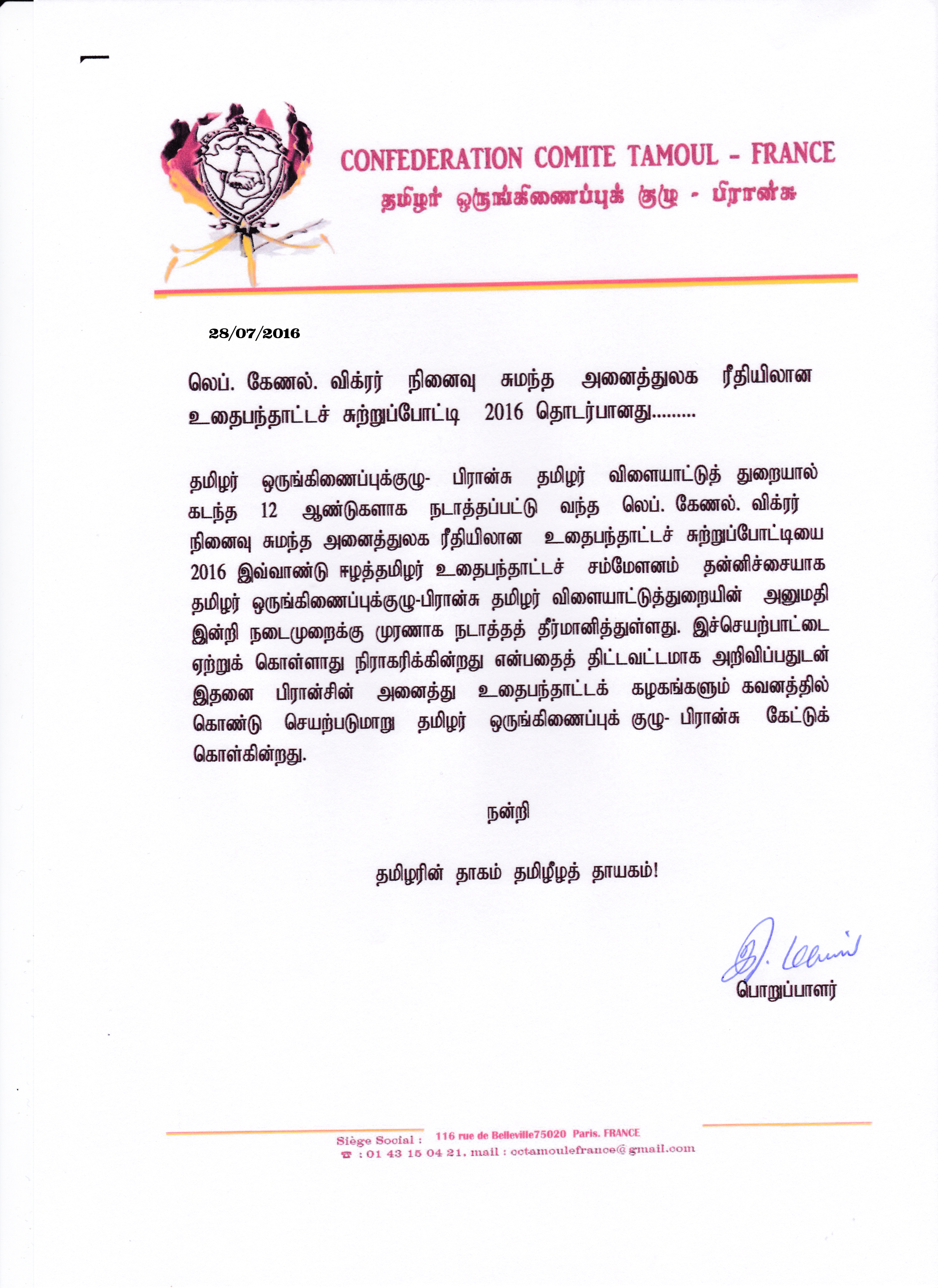 தமிழர் ஒருங்கிணைப்புக்குழு பிரான்சு, தமிழர் விளையாட்டுத்துறையால் கடந்த 12 ஆண்டுகளாக நடாத்தப்பட்டுவந்த லெப். கேணல் விக்ரர் நினைவு சுமந்த அனைத்துலக ரீதியிலான உதைபந்தாட்டச் சுற்றுப் போட்டியை (2016) இவ்வாண்டு ஈழத்தமிழர் உதைபந்தாட்டச் சம்மேளனம் தன்னிச்சையாக தமிழர் ஒருங்கிணைப்புக் குழு – பிரான்சு தமிழர் விளையாட்டுத்துறையின் அனுமதி இன்றி நடைமுறைக்கு முரணாக நடாத்த தீர்மானித்துள்ளது.