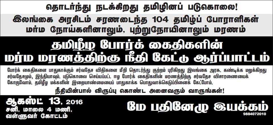 ஈழப் போர்க்கைதிகளான விடுதலைப்புலி போராளிகளை கொன்று அழிக்கும் சிங்களப் பேரினவாதத்தின் மறைமுக யுத்தத்தினை அம்பலப்படுத்தவும், தமிழக மக்களுக்கு இதன் பயங்கரவாதத்தினை எடுத்துச் சொல்லவும் ஒன்று கூடுகிறோம்.