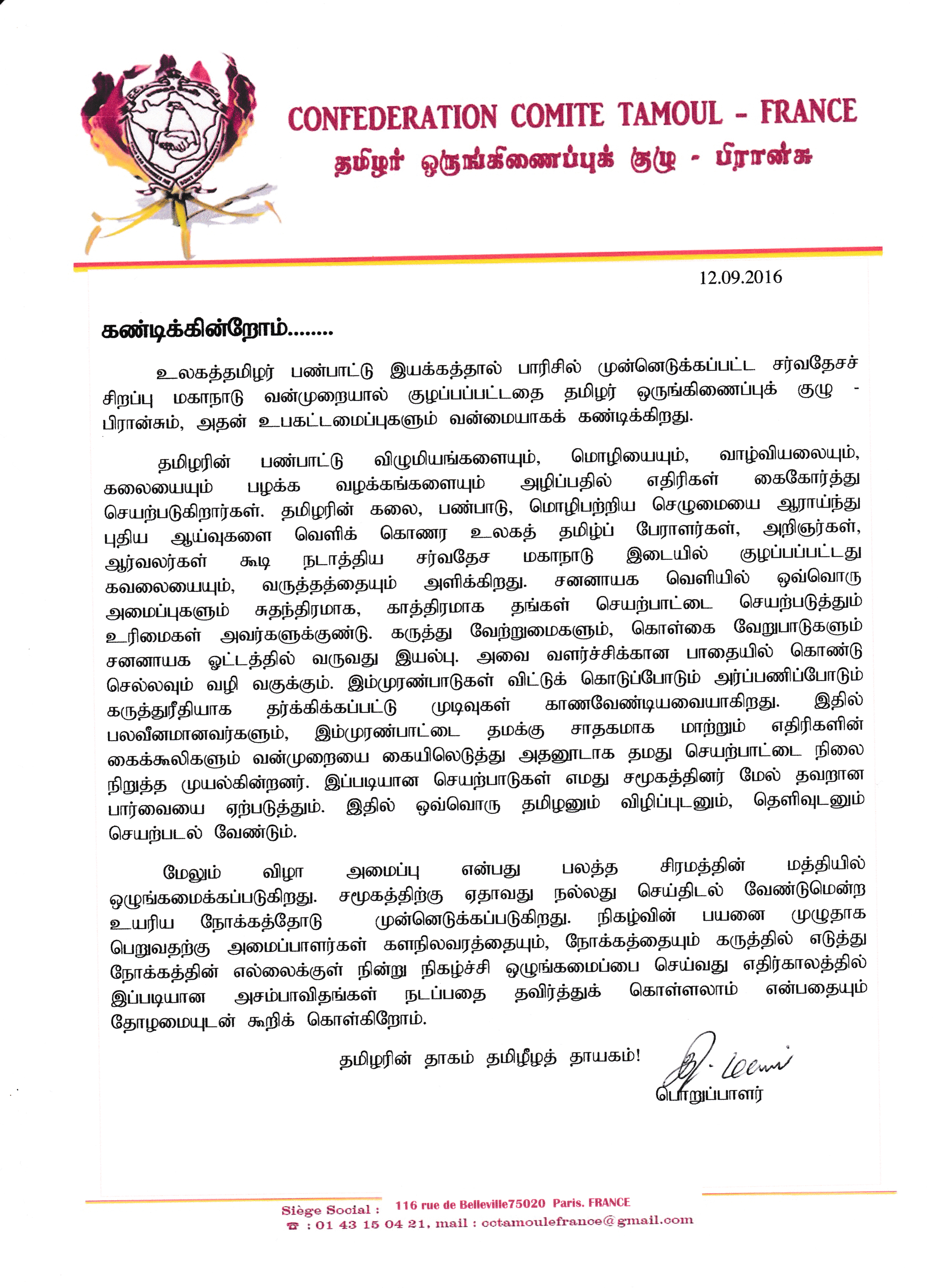 கடந்த ஞாயிற்றுக்கிழமை உலகத் தமிழர் பண்பாட்டு இயக்கத்தால் பாரிசில் நடாத்தப்பட்ட சர்வதேச சிறப்பு மகாநாடு வன்முறையால் குழப்பப்பட்டதைக் கண்டித்து, பிரான்சு தமிழர் ஒருங்கிணைப்புக்குழு அறிக்கை ஒன்றை வெளியிட்டுள்ளது.
