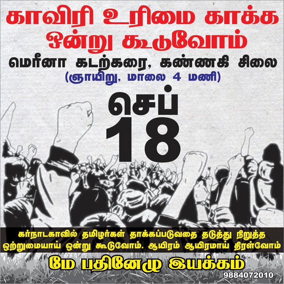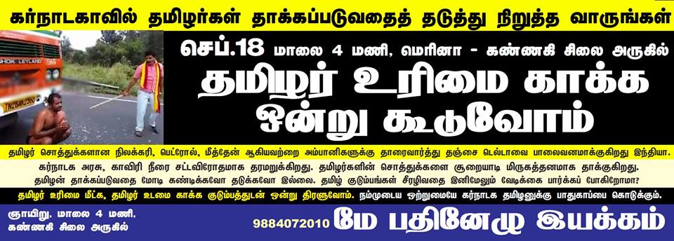 கர்நாடக இனவெறி அரசு தமிழர்களின் காவிரி நீர் உரிமையை சட்டவிரோதமாக தடுக்கிறது. தமிழர்களை மிருகத்தனமாக தாக்குகிறது. தமிழர்களின் சொத்துக்களை சூறையாடுகிறது. நடத்தப்பட்ட தாக்குதல் திட்டமிடப்பட்ட வன்முறை. பெங்களூரில் 1990களில் நடந்ததைப் போன்றும், ஈழத்தில் 70-80களில் நடந்ததைப் போன்றும், 2001இல் குஜராத்தில் நடந்ததைப் போன்றதுமான திட்டமிடப்பட்ட தாக்குதல்.