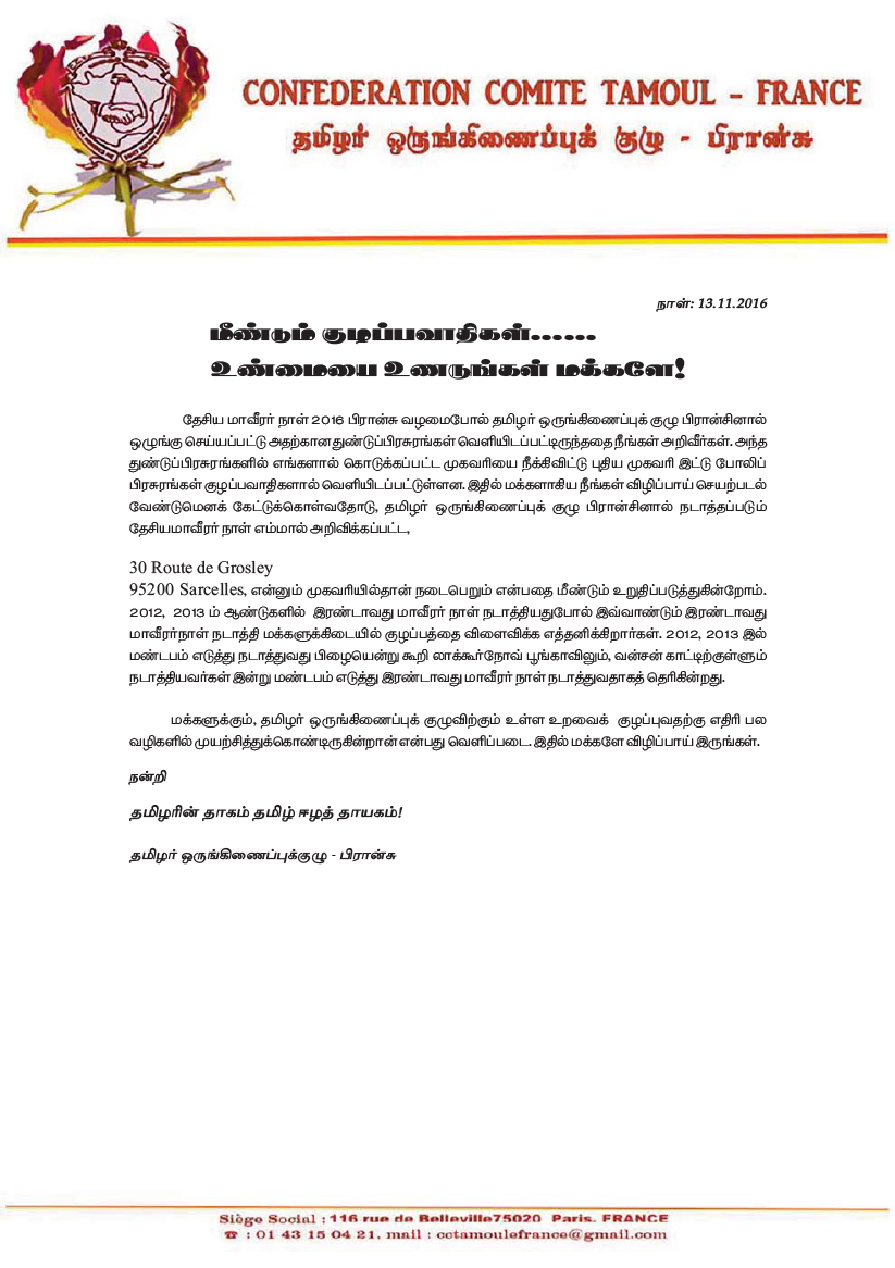 சிறப்பு செய்திகள்புலத்துச்செய்திகள் பிரான்சு வாழ் மக்களுக்கு தமிழர் ஒருங்கிணைப்புக்குழு விடுக்கும் முக்கிய அறிவித்தல்! By Admin - November 14, 2016 0 684 பிரான்சு வாழ் மக்களுக்கு தமிழர் ஒருங்கிணைப்புக்குழு விடுக்கும் முக்கிய அறிவித்தல்!